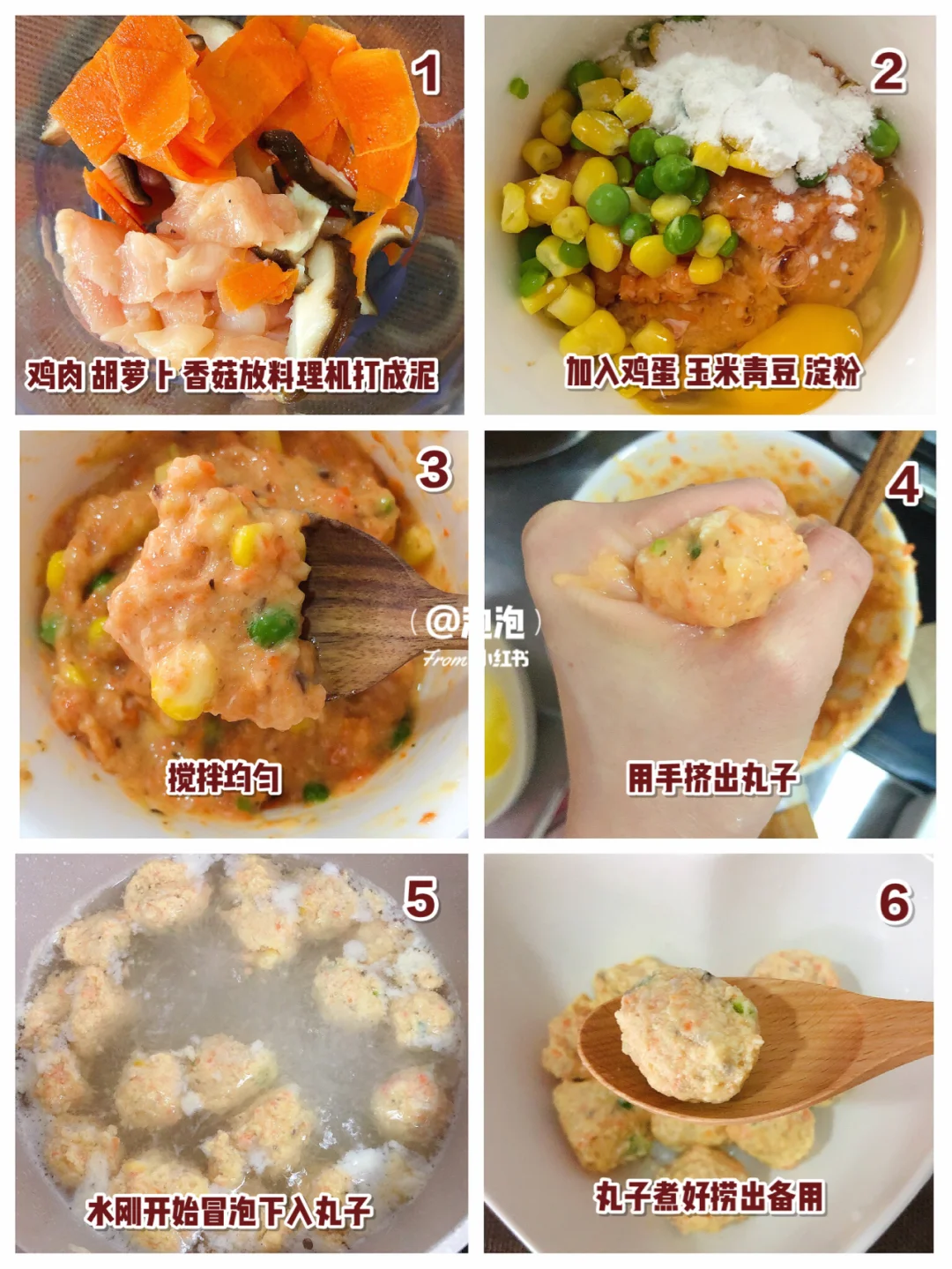 🎈把鸡肉、胡萝卜、香菇放料理机打成泥,再放入玉米、青豆、一个鸡蛋、适量淀粉、少许盐搅拌均匀。