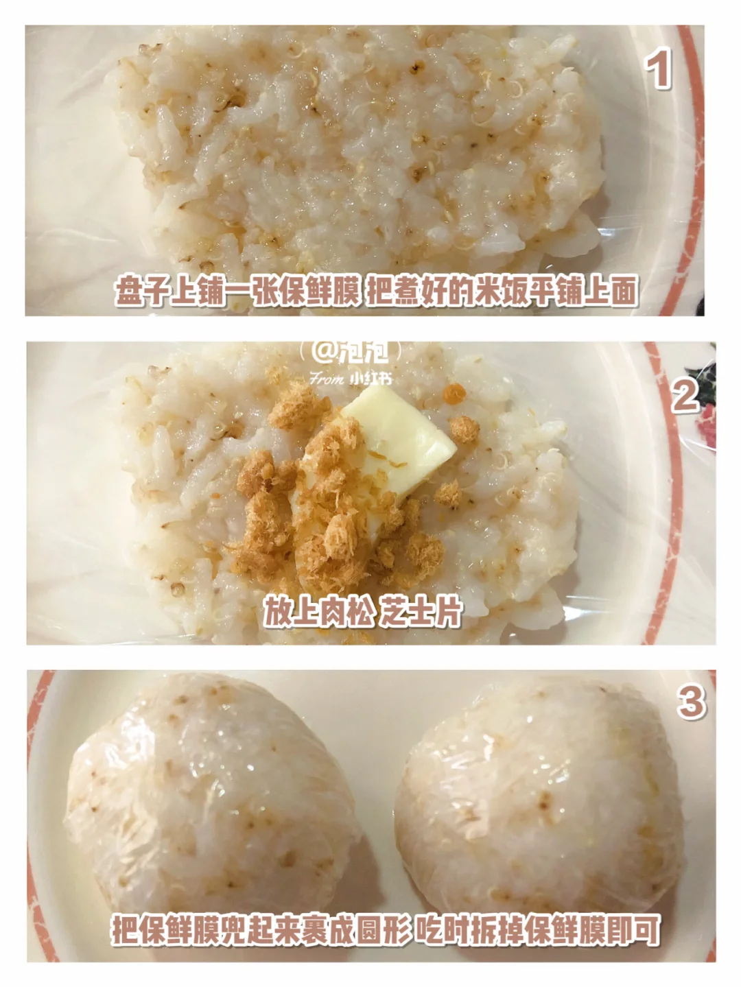 🎈提前把胚芽米和藜麦煮成米饭,盘子上铺上保鲜膜,舀一勺米饭平铺在上面,放上肉松和芝士片,把保鲜膜四周兜起来整成圆形,等吃的时候拆掉保鲜膜即可。