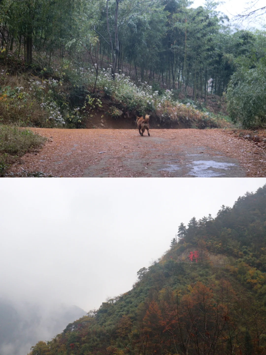 ⛰️随意穿行,偶遇惊喜。我们在起点,碰到了两只小狗,暂且称呼为小黄和小白夫妻吧,这两条狗从起点开始带领着我们走向终点,无论是我们走走停停多久,它们总是很有耐心的等待着我们跟上,仿佛护送我们这一程是它的使命,就像眼前的金钱松一样简直太有灵性了。