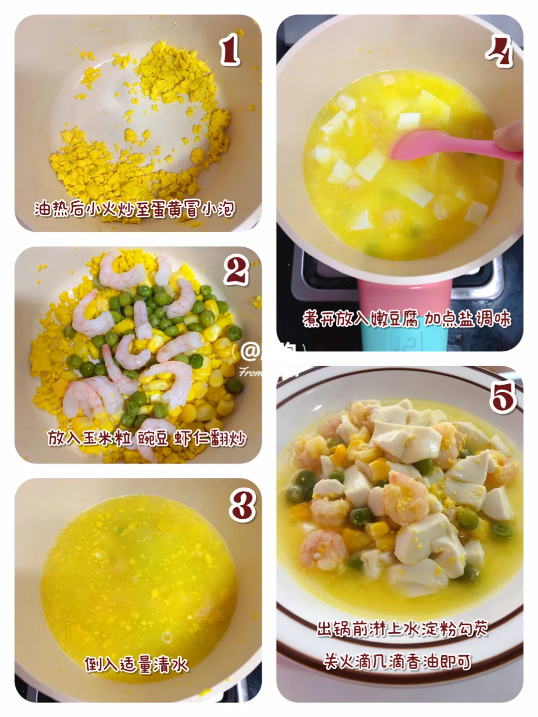 🎈锅中倒入宝宝油,油热后小火翻炒蛋黄,炒到有微小冒泡,放入玉米粒、豌豆、虾仁翻炒一下,倒入适量清水,煮开,放入嫩豆腐,顺时针搅拌一下,煮3分钟左右,加盐调味,出锅前淋上水淀粉勾芡.关火滴几滴香油即可.