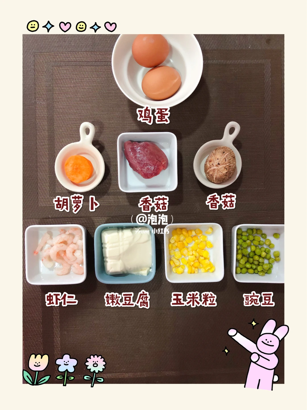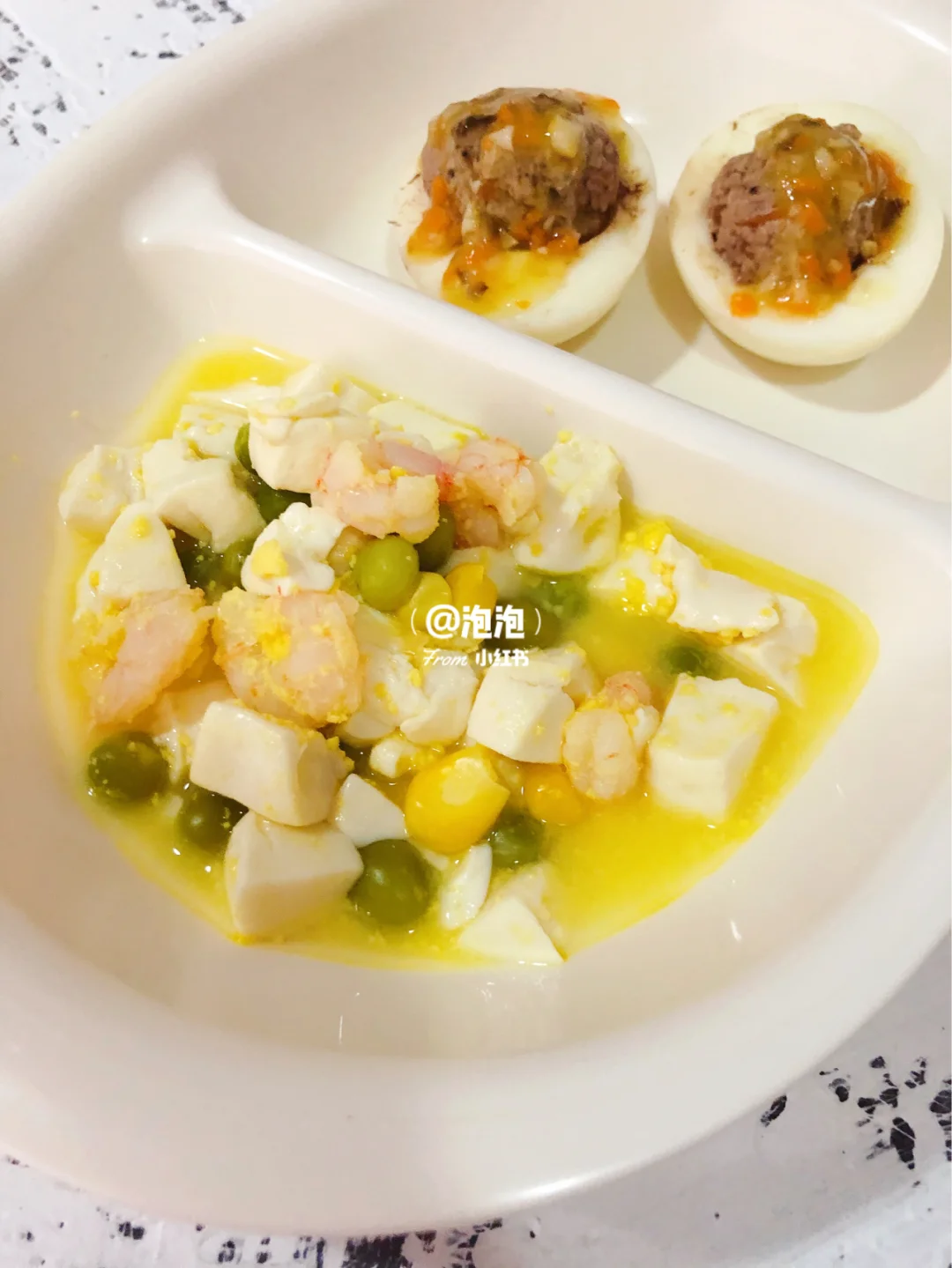 🎈鸡蛋煮熟,蛋黄取出碾碎备用,虾仁洗净、嫩豆腐用清水冲一下切块,玉米粒洗净,豌豆我是用煮熟的.