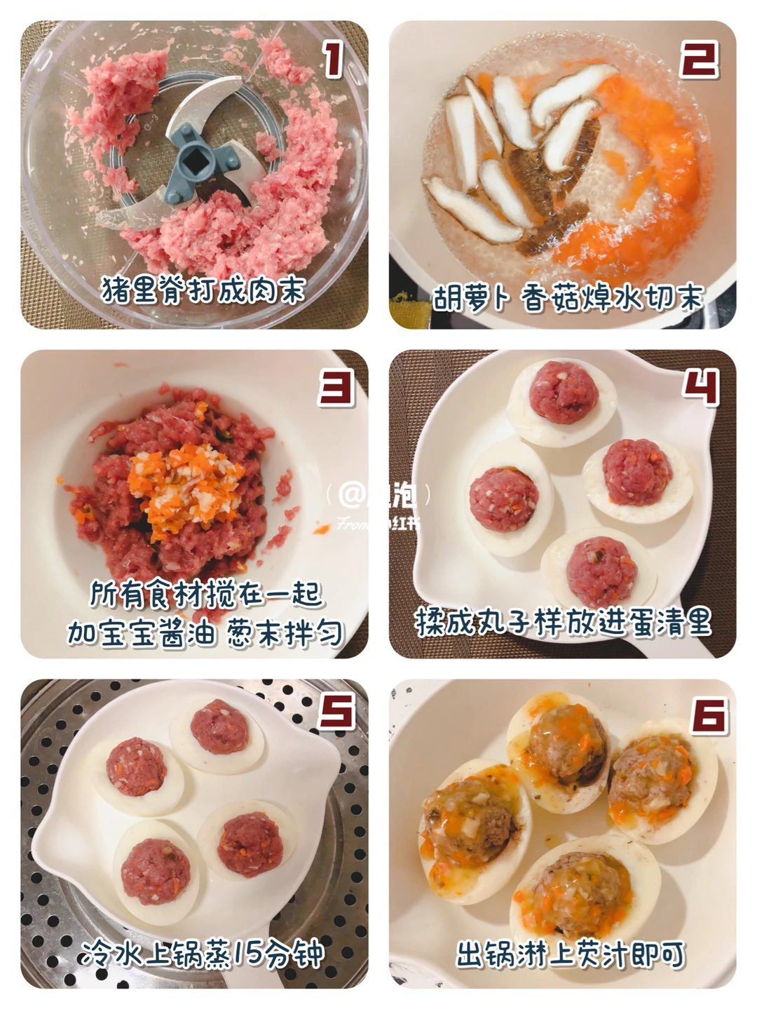 🎈鸡蛋煮熟,蛋清一切为二备用,猪里脊多泡一会,期间多换几遍水,去筋膜切块放拉拉神器打成肉末.胡萝卜和香菇焯水切碎末.