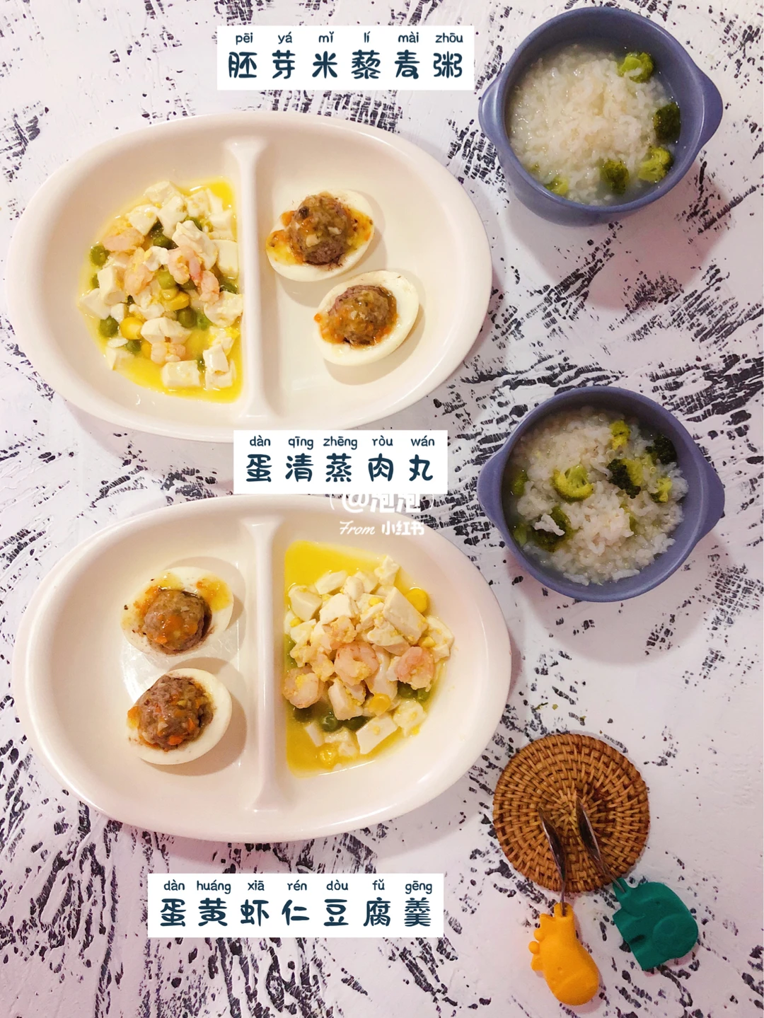 午餐:🌟蛋黄虾仁豆腐羹 & 🌟蛋清蒸肉丸 &🌟胚芽米藜麦粥