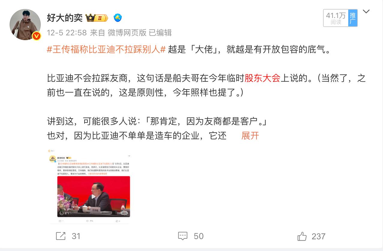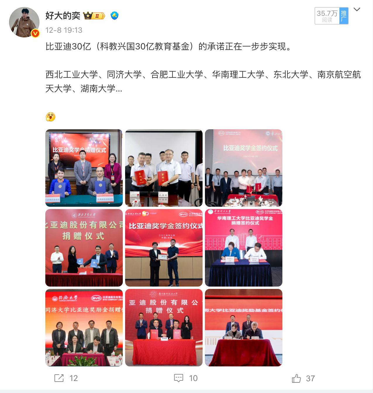 比亚迪算是汽车史上的工业奇迹吗?不知道大家对这一幕有没有印象。在24年的北京车展上,王传福在某家合资车企的展台上看车。(图1)他绕着展台走了一圈,并上前看了一眼车里的内饰,随即关上车门回头笑了一下。这个笑是发自内心的笑,是一种属于新时代的笑。为什么这么说呢?我们把时间轴拉回到10年前的北京车展。(图2)那会儿在展馆里几乎都是合资车的天下,我们的五菱宏光还得靠模特在展台前面吹拉弹唱吸引观众。而比亚迪的唐也是那一届车展开始亮相。从14年的北京车展到24年、25年的车展,展馆里最为火热的展台是我们自主品牌的车企,被围得水泄不通的也是我们自主品牌,能让外国人趴在地上看底盘、能让外国人站在展台前目不转睛的依旧还是我们自主品牌。(图3)如果说时间有刻度,那么我觉得比亚迪应该是这个刻度上最具有代表性的。从0到100万辆,比亚迪用了13年的时间。从100万辆到500万辆,比亚迪用了2年3个月。从500万辆到1000万辆,比亚迪仅仅用了15个月。从500万辆之后,每隔2-3个月,比亚迪就拿下一个百万里程碑。直至今天,比亚迪第1500万新能源汽车在济南生产车间正式下线。(图5)这在汽车史上,是绝无仅有的。当然,如果你认为汽车工业的奇迹不单单是销量,那么其实比亚迪还有技术能让世人感叹。从DM技术、E3方平台、天神之眼、兆瓦闪充,从5分钟补能400公里,从每日辅助驾驶数据达到1.5亿公里,从百公里时速爆胎能保持稳定前行,从5米长的车型实现最小转弯半径4.58米。也许你还会说,光有销量和技术也还是不行。这我能理解,毕竟要谈上一个行业里绝无仅有的大哥身份,都需要有过硬的素质和强大的社会责任心才行。那我们再把时间线拉回到3年前。那会儿口罩的资源非常紧张,就在这种背景下,比亚迪意识到了社会上的需求,所以赶忙召集了相关人员,3天出图纸、7天出设备、13天出口罩、24天做到全球第一大口罩厂,最高日产量达到1亿只。(图6)社会需要什么,比亚迪就造什么,这就是社会责任感。当然,这一切都离不开王传福的眼光、离不开比亚迪的12万工程师天团、离不开比亚迪上上下下每一位员工、离不开整个社会对比亚迪的好。所以比亚迪也一直牢记着「自己是从哪来,要前往何处」。2024年底,比亚迪宣布捐资30亿元设立教育慈善基金,用于高校奖学金和新能源技术科普。(图7)王传福在启动仪式上说了这么一句话:「如果没有科教兴国战略,就不会有比亚迪的今天,也不会有中国新能源汽车的今天。」如果是深入了解比亚迪的同学就会知道,这句话确实不是客套话。它从借来的250万元起步,到如今全球新能源汽车的领军者,比亚迪比任何人都清楚人才和技术的重要性。这笔捐赠恰恰就是一个民族企业试图反哺社会的深切情怀,也是为中国汽车工业培养下一代工程师的长远布局。如上所述,你会发现,比亚迪几乎全方位做到了「大哥、长辈」该有的模样。(图9)既然家里面好起来了,既然我们站起来了,那就该挺起胸堂,和老外比比。2025年前11个月,比亚迪在海外市场卖出了超过91万辆汽车。在英国,比亚迪用两年时间从无人知晓到超越特斯拉和Mini等品牌,成为当地市场的黑马。在德国这个汽车王国,比亚迪销量同比增长824%,连续两个月超越特斯拉。在泰国、新加坡、巴西,比亚迪也屡次斩获新能源销冠。在匈牙利设立欧洲总部,与当地高校开展联合科研。在巴西建厂,实现本地化生产,连巴西总统卢拉都成为比亚迪的车主。并且,针对日本独特的K-car市场专门开发RACCO车型。(图8)聊到这,大家应该就知道「汽车工业史上的奇迹」意味着什么了吧?比亚迪的故事(从成立到市场认同再到出海)就是一部从「走出来」到「走出去」再到「融进去」的进化史。正如前面所说,如果「工业奇迹」是单靠销量数字堆砌起来的,那我认为它太虚了。可比亚迪却不是如此。它更像是一个生态系统、一种发展模式的胜利。它用三十年时间,走完了传统汽车巨头百年的道路,并且是以一种全新的方式。你会意识到,这不再仅仅是一家中国企业的成功,而是全球汽车产业进步的一个标志性事件。那么我们再回到开头说的王传福那个「跨时代的笑」。他笑的不是那一家合资车的内饰,他发自内心的笑,笑的是属于那个被技术封锁、被专利墙围追堵截的旧时代,终于翻篇了。而我们,就是翻页的那只手。而他也见证了一个时代的更替,见证了中国汽车从追随者到引领者的蜕变。你不可否认,这就是一个国家工业体系成熟、科技创新能力爆发、全球竞争力提升的生动体现。