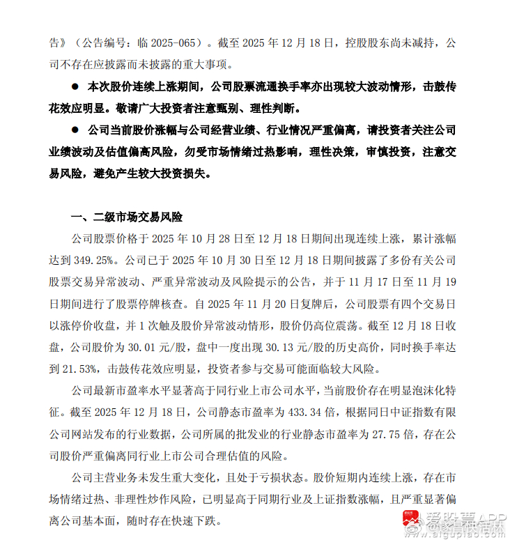 a股 $合富中国 sh603122$ 【合富中国:当前股价存在明显泡沫化特征 击鼓传花效应明显】603122 合富中国公告,公司股价短期内连续上涨,可能存在市场情绪过热、非理性炒作风险,已明显高于同期行业及上证指数涨幅,且严重显著偏离公司基本面,随时存在快速下跌风险。公司主营业务未发生重大变化,且处于亏损状态。目前股价涨幅与公司经营情况严重偏离。公司最新市盈率水平显著高于同行业上市公司水平,当前股价存在明显泡沫化特征。本次股价连续上涨期间,公司股票流通换手率亦出现较大波动情形,击鼓传花效应明显。敬请广大投资者注意甄别、理性判断。