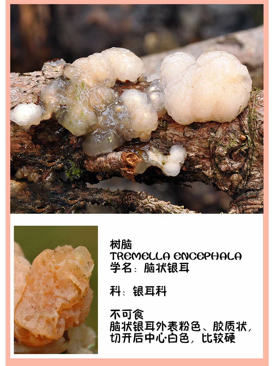树脑 tremella encephala 学名:脑状银耳 科:银耳科 图片©josef hlasek©manatarka.org 不可食[doge] 脑状银耳外表粉色、胶质状,切开后中心白色,比较硬