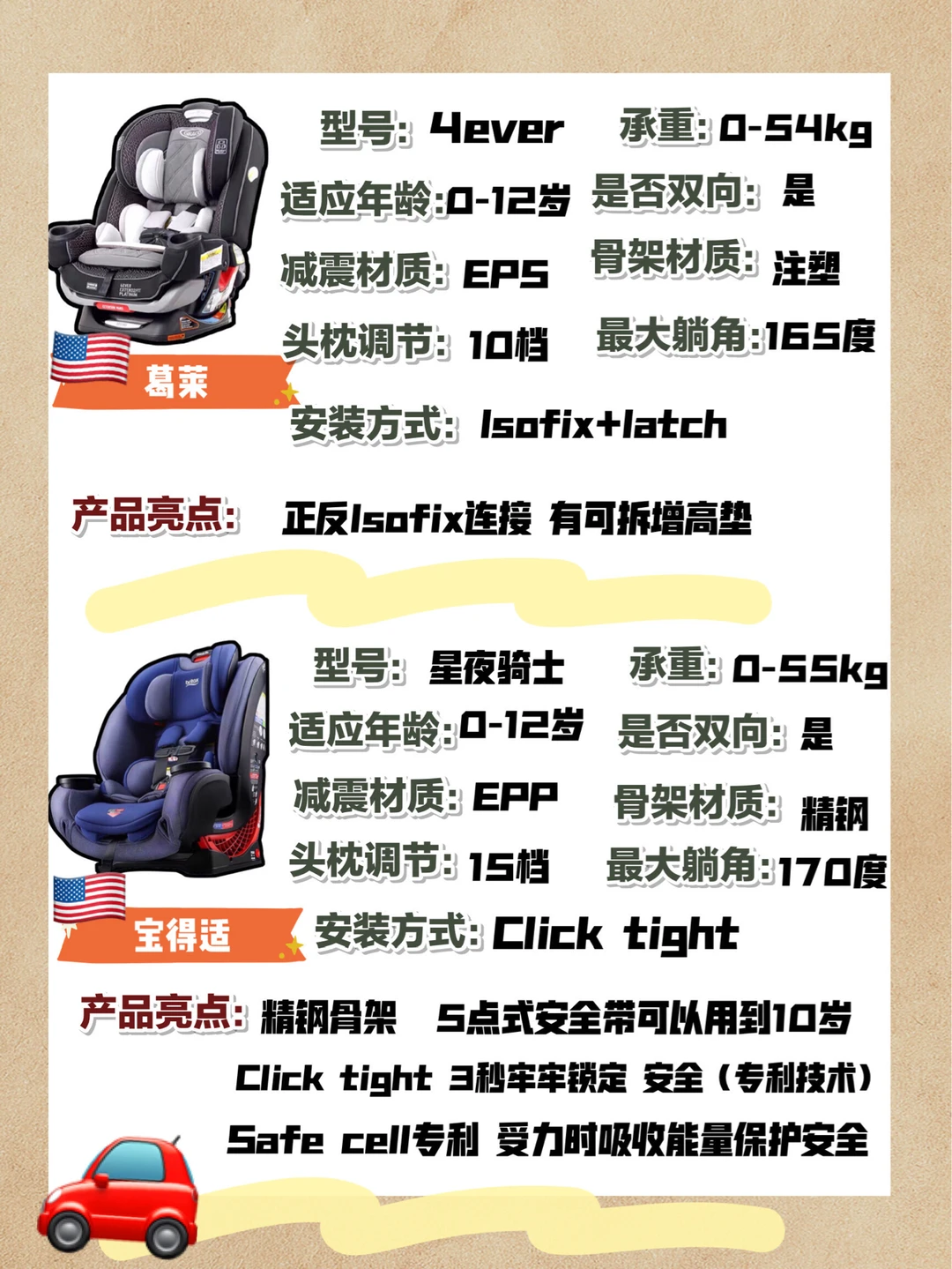 我最终选的星夜骑士,它除了有click tight专利外,还有safe cellx这个专利,受力时可吸收能量.五点式还能用到10岁,承重能力也强,很厉害的一款座椅