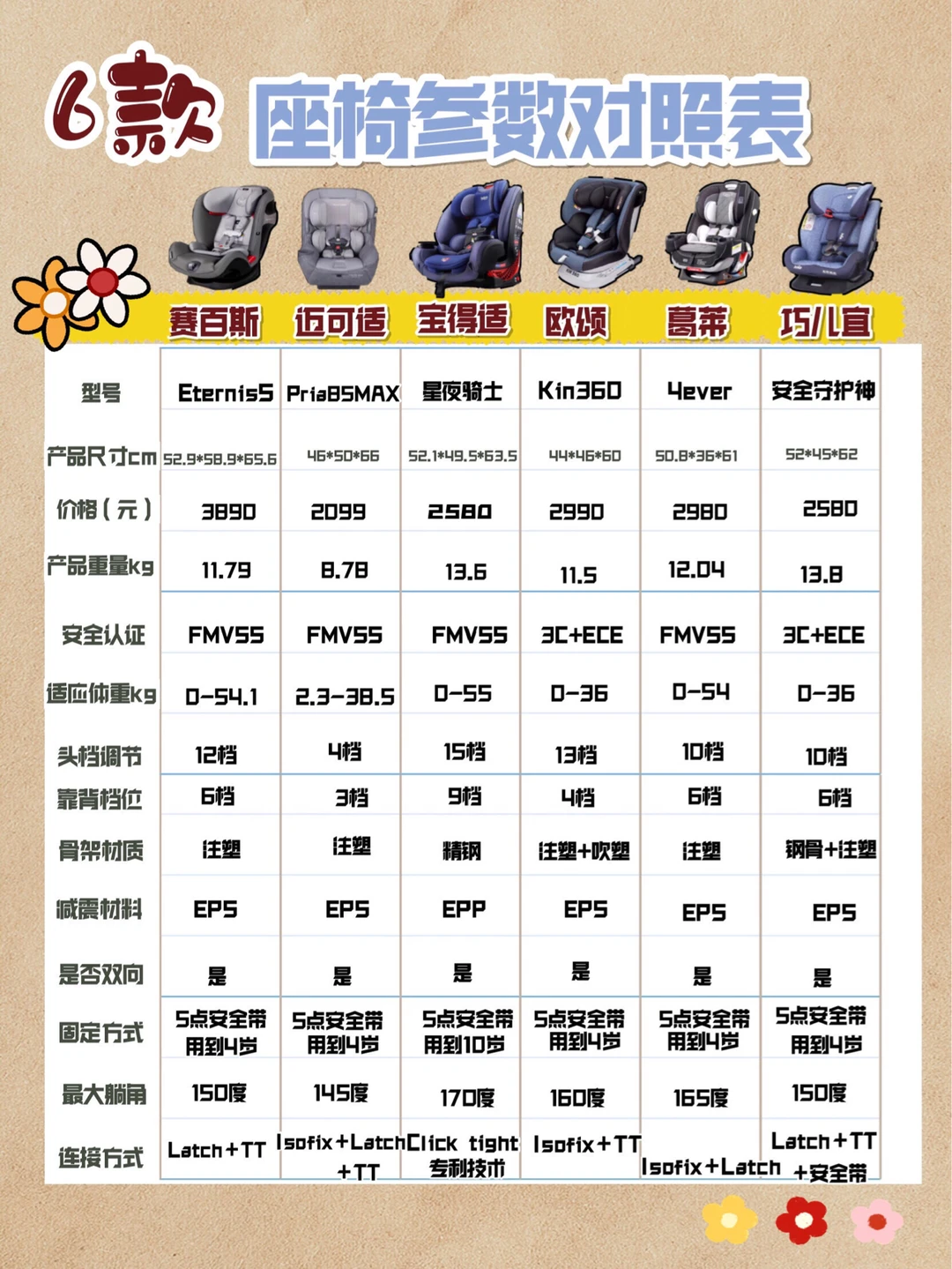这6款都是五点式安全带,其中宝得适和迈可适能用到10岁,其他5款用到4岁。