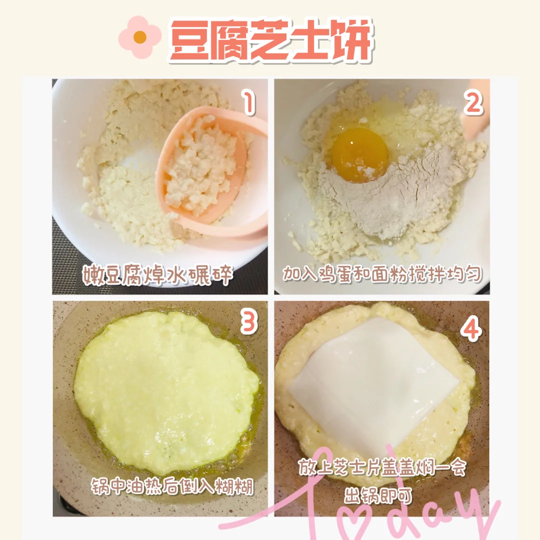 🎈嫩豆腐用清水冲洗一下,焯水后碾碎,放入鸡蛋和适量的面粉,搅拌均匀,锅中倒入宝宝油,油热后倒入调好的糊糊,煎一下,待快煎好的时候最后放入芝士片,盖上锅盖,焖一会,芝士变软关火即可.