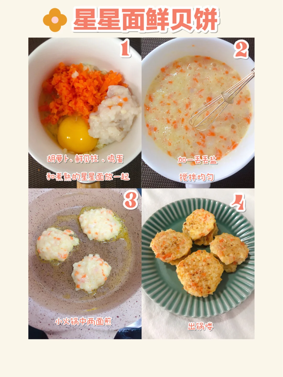 🎈星星面煮熟备用,鲜贝柱洗净切碎末,胡萝卜去皮焯水切碎末,鸡蛋一个备用。把所有食材放在碗里,加一点盐搅拌均匀,锅中刷油,油热后小火两面煎至金黄出锅即可。(💡煎的时候不要着急翻面,待稍稍定型后再翻,觉得不好操作可以加一点淀粉进去)
