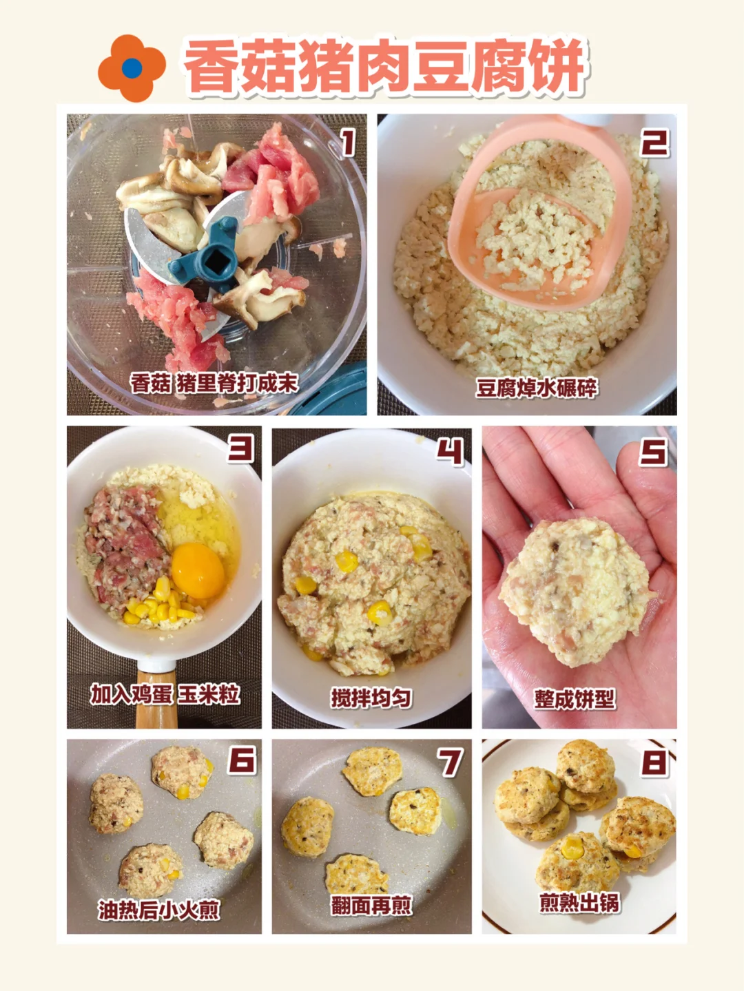 🎈香菇、玉米焯水备用,豆腐焯水碾碎,猪里脊去筋膜洗净切小块,猪里脊和香菇用料理机打成末,加入豆腐、一个鸡蛋、玉米粒,加一点盐搅拌均匀,依次把糊糊左右手来回摔成饼状,锅中刷油,油热后小火两面煎熟出锅即可。