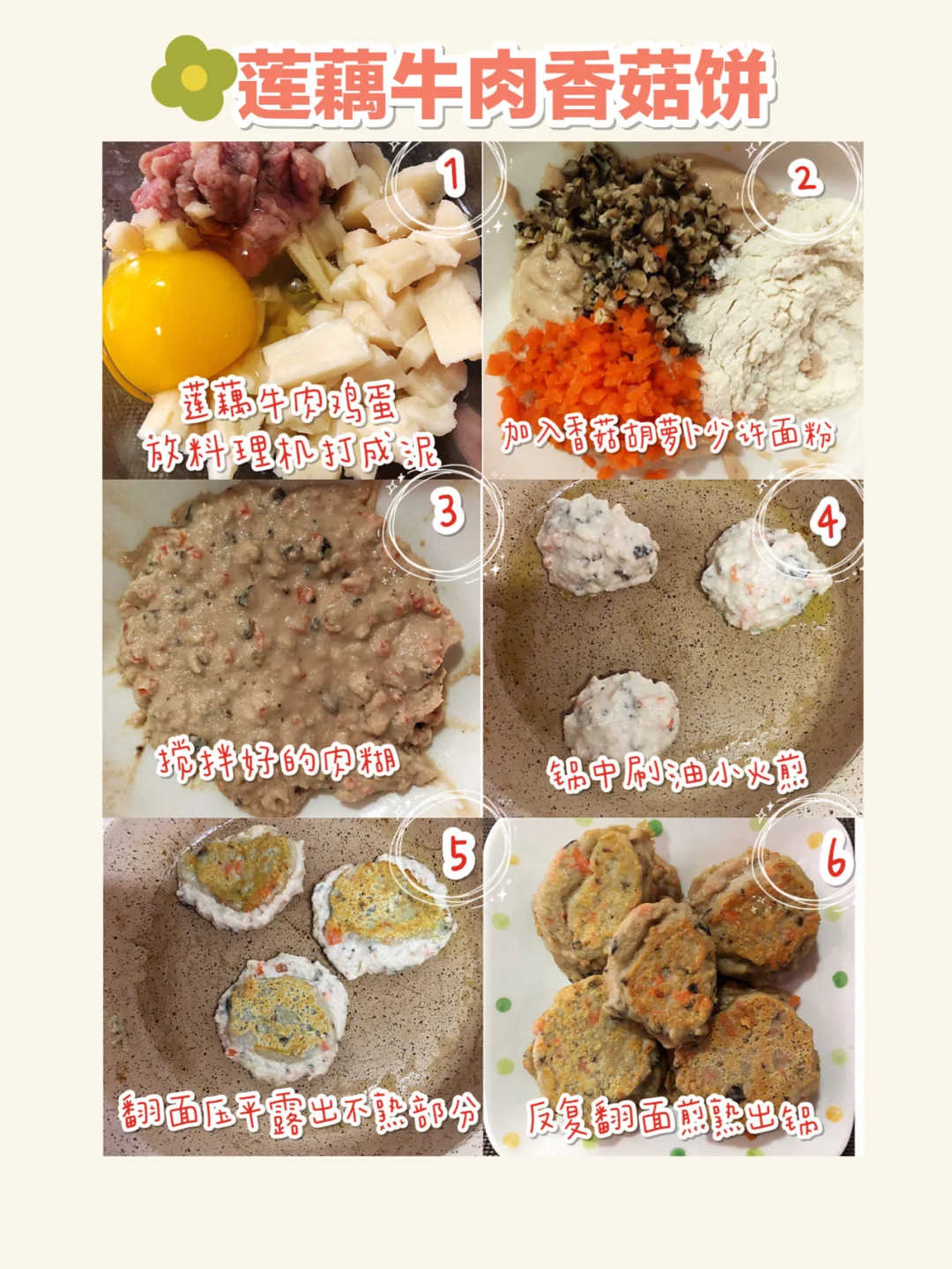🎈干香菇提前泡发软(鲜香菇省去这部)焯水切末,胡萝卜去皮焯水切末,莲藕去皮切小块,牛肉去筋膜洗净切小块。把处理好的莲藕、牛肉、一个鸡蛋放料理机搅打成糊糊,再加入胡萝卜末,香菇末和少许面粉,一点盐搅拌均匀,锅中刷油,油热后把糊糊两面煎熟即可。