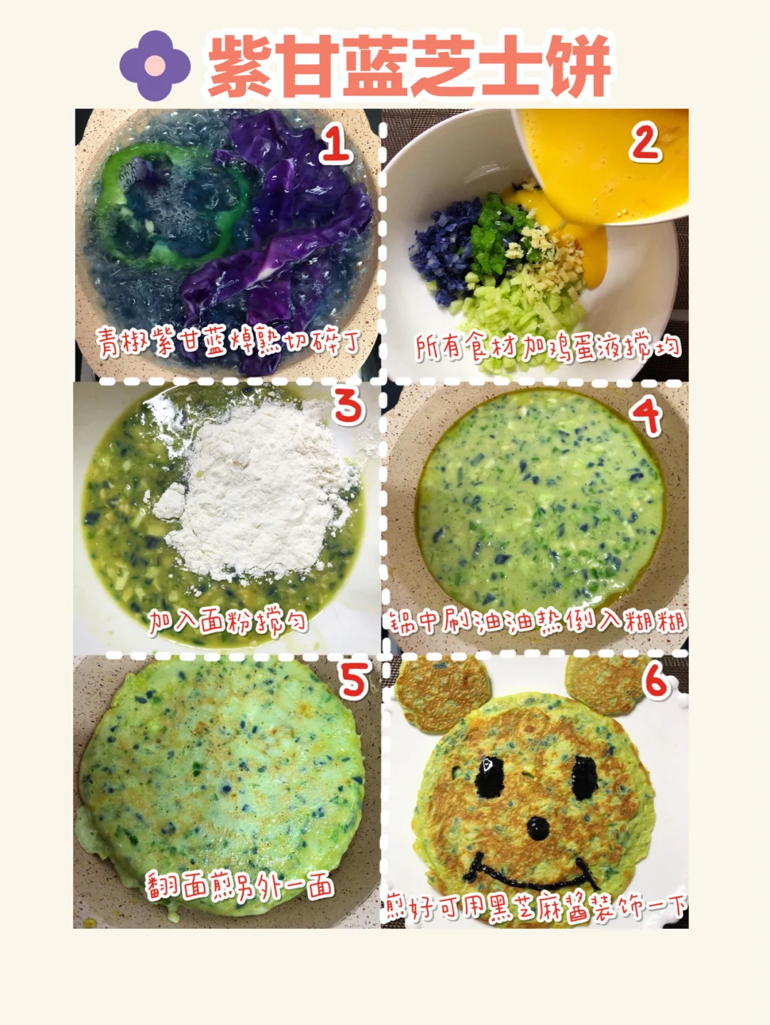 🎈紫甘蓝、青椒洗净焯水切碎,黄瓜去皮切碎,奶酪切碎末,鸡蛋打散备用。把处理好的紫甘蓝、青椒、黄瓜、奶酪和鸡蛋放在一起搅均,再放入一点面粉搅匀。锅中刷油,油热后,小火把糊糊两面煎熟出锅即可.