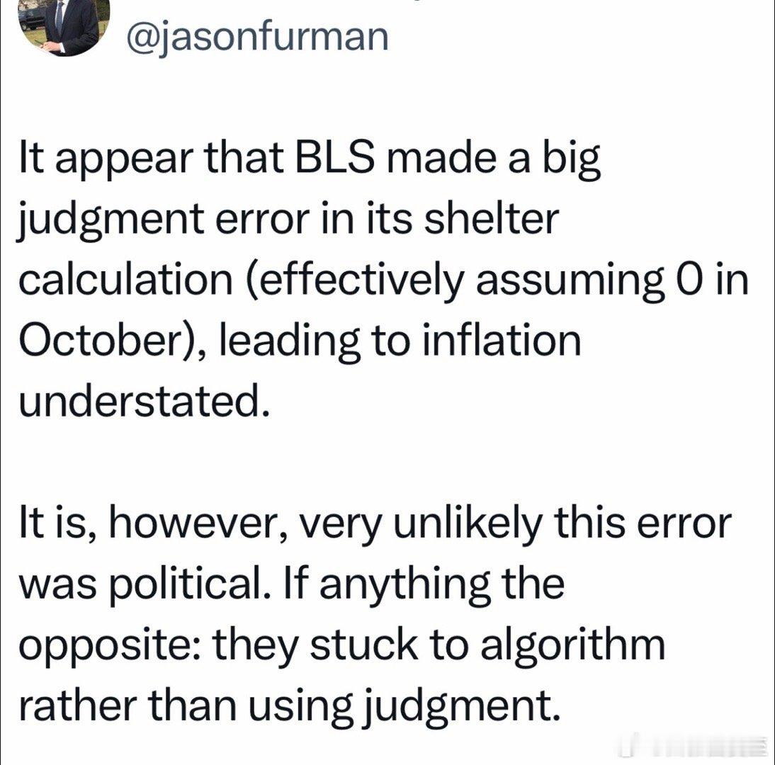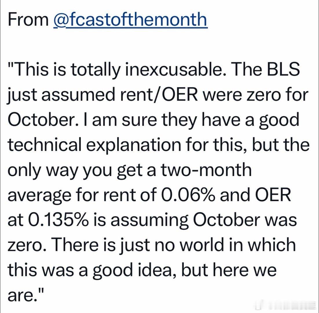 11月CPI通胀低于预期,经济学家普遍认为:与缺乏10月数据有关(政府关门)例如,“住房”一项,没有数据,算法赋予的值为零0️⃣,成为“月均“的基础,使得11月房租/房贷额外低,成为11月通胀“大跌”的重要因素