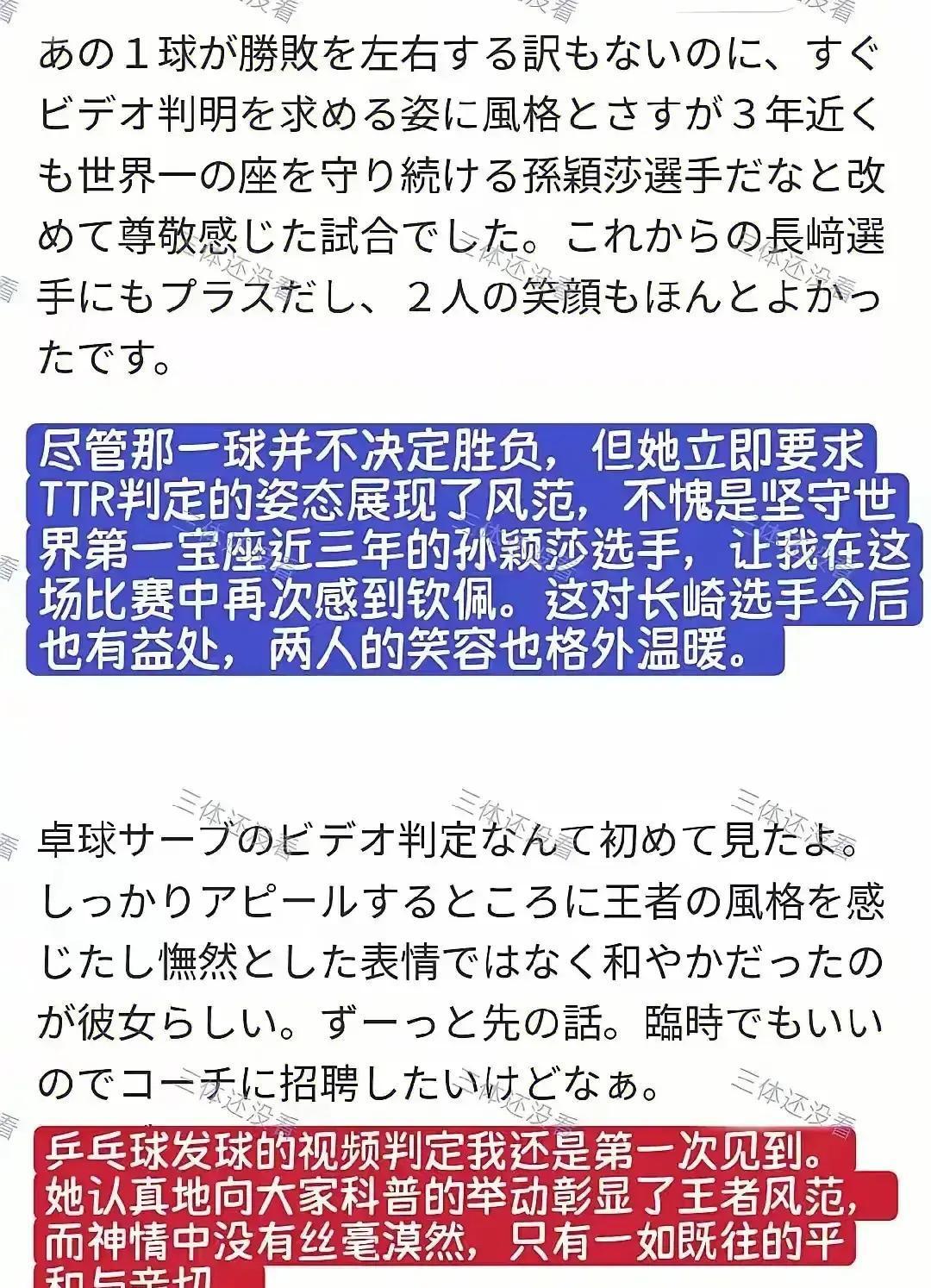 你挑战对手犯规,对手反而更尊重你。孙颖莎就这么干了。 香港总决赛,她直接鹰眼挑战长崎美柚发球回抛超40度。没有争吵,没有黑脸。她走近裁判,平静指出规则条款,然后指向回放屏幕——证据清晰。裁判改判。这一分钟,她没把长崎当成敌人,而是在维护乒乓球规则本身的尊严。 赛后,长崎美柚做了件罕见的事:主动在社交媒体发布两人合照,配文“发球练习中”。日本球迷涌入评论区,高频词不是“可惜”,而是“格局”和“人品”。国际乒联主席评价这是“新生代球员的良性竞争”。蝴蝶牌球拍在日本的搜索量应声涨了37%。 巴黎奥运,发球检测器将全程开启。孙颖莎提前演示了,最高级的赢法:让规则站在你这边。当所有人钻研如何钻空子时,真正的王者选择成为规则的代言人。 最高级的赢,不是让对手低头,而是让规则开口说话。