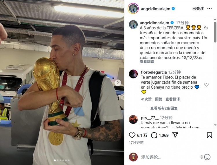 迪马利亚写道:“第三座世界杯冠军的三周年,我国最重要的时刻之一,已经过去三年。一个梦寐以求的时刻,一个独一无二的时刻,一个已经并将继续铭刻在我们每个人记忆中的时刻,2022年12月18日。”