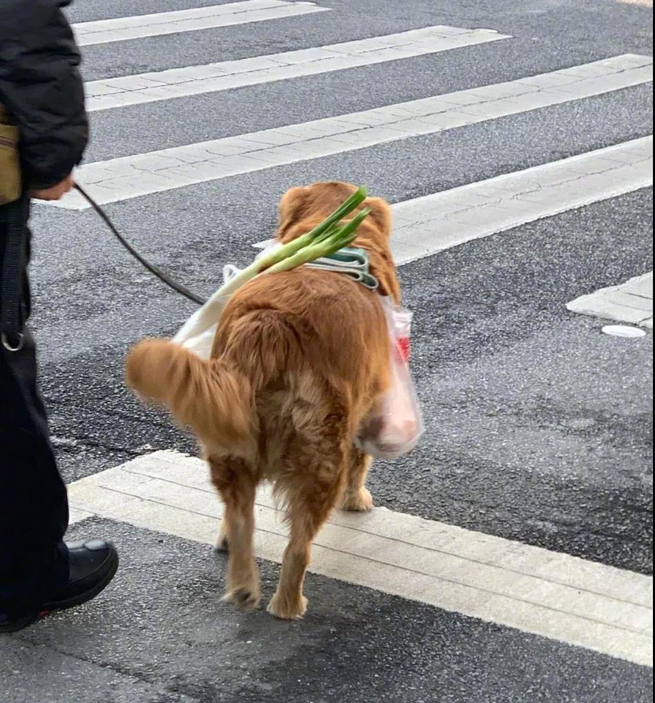 金毛真的太乖了吧,还能帮主人拎菜!金毛:没办法,他的手还要用来牵我呀~