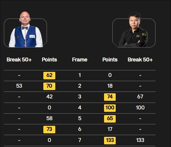 全场比赛宾汉姆打出1杆50+,周跃龙打出2杆100+和1杆50+。