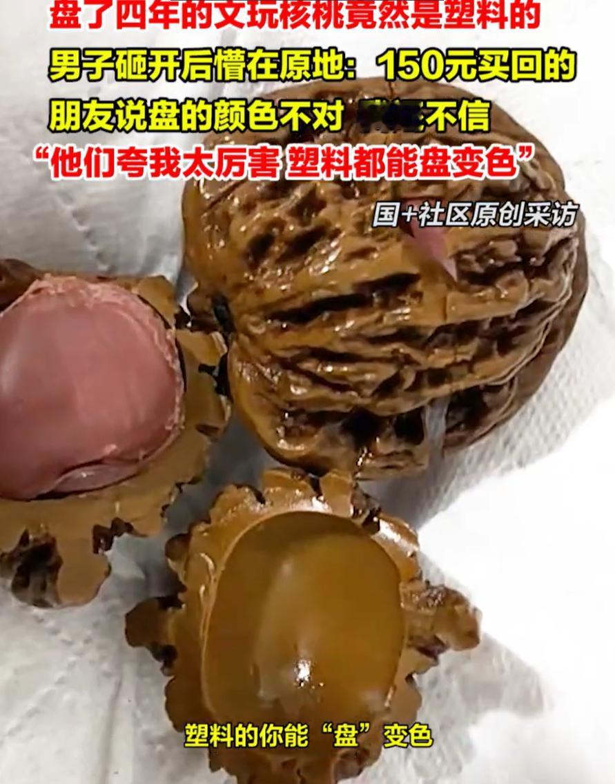 唐山男子盘四年核桃变包浆, 花150元买个塑料, 朋友指证才知被骗。 刘先生四年前花了150块买对文玩核桃,每天把玩四年。 最近朋友来家里,拿起核桃说颜色不对劲。 刘先生不信,但朋友说得肯定,他就把核桃砸开,里面全是塑料。 有网友说更惨的是有人买塑料小海马泡酒十二年,瓶子碎了才发现假的。 玩文玩真假难辨,光靠手感和经验没用,得找专业渠道验证。 现在刘先生既生气又好笑,塑料核桃盘了这么久。 玩东西图个开心就行,别总想着升值,更别信手感骗自己。