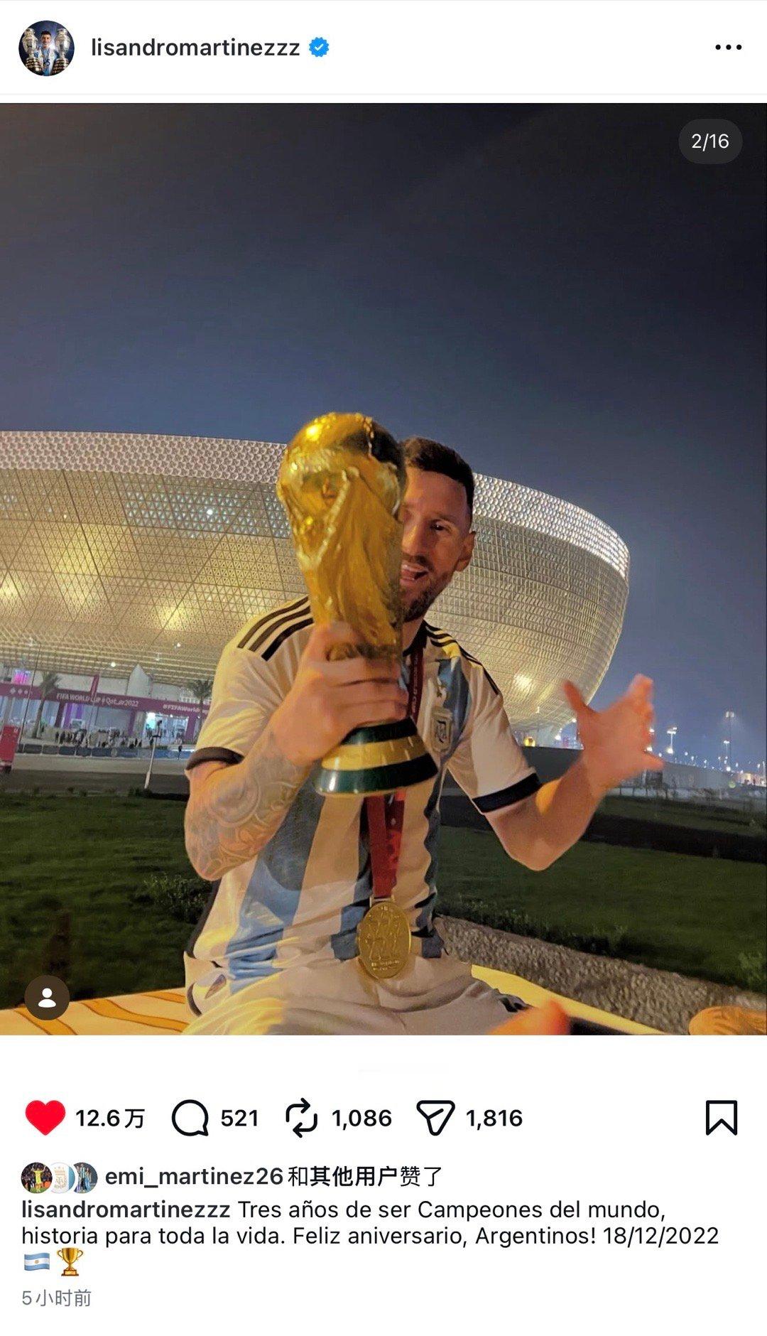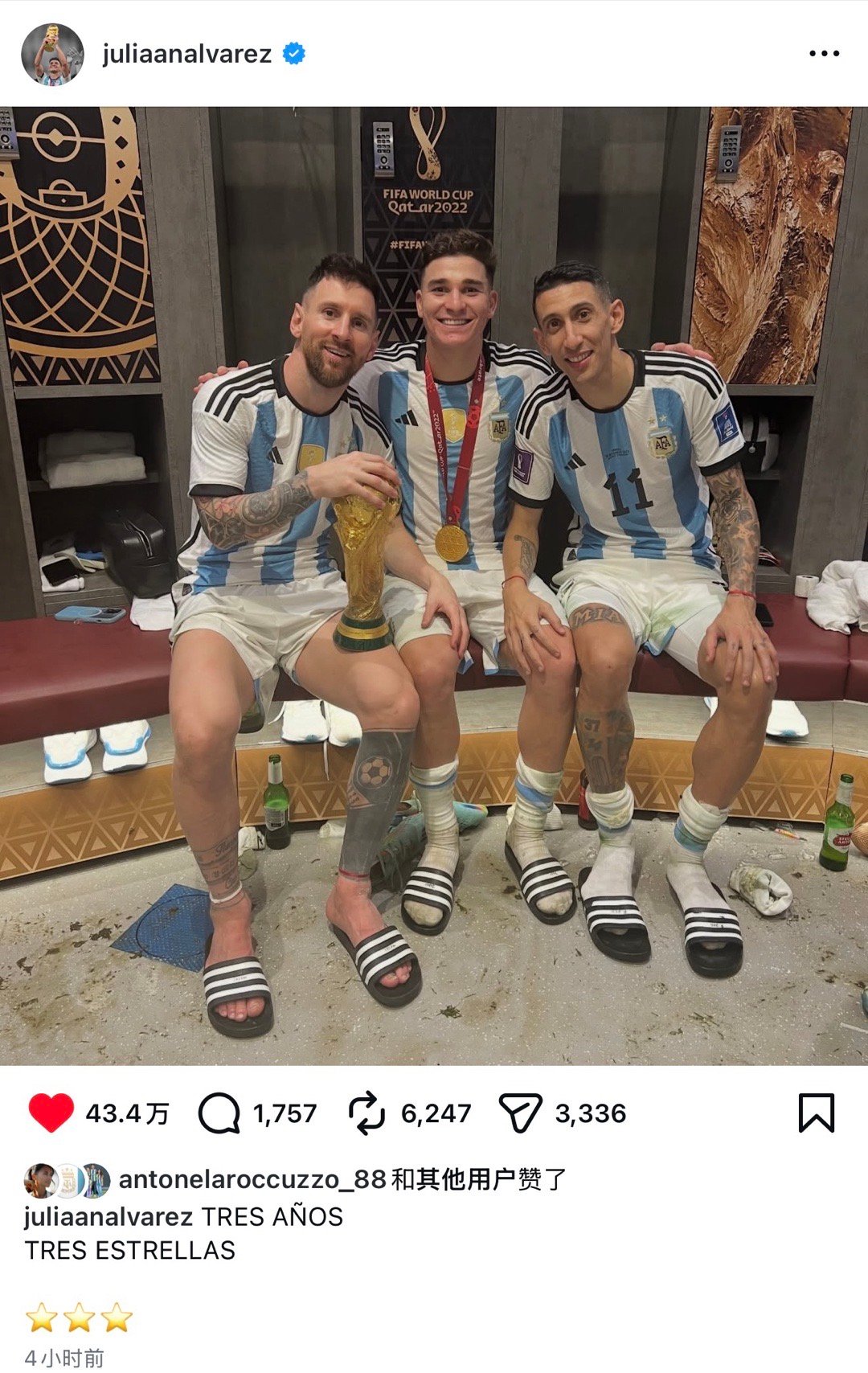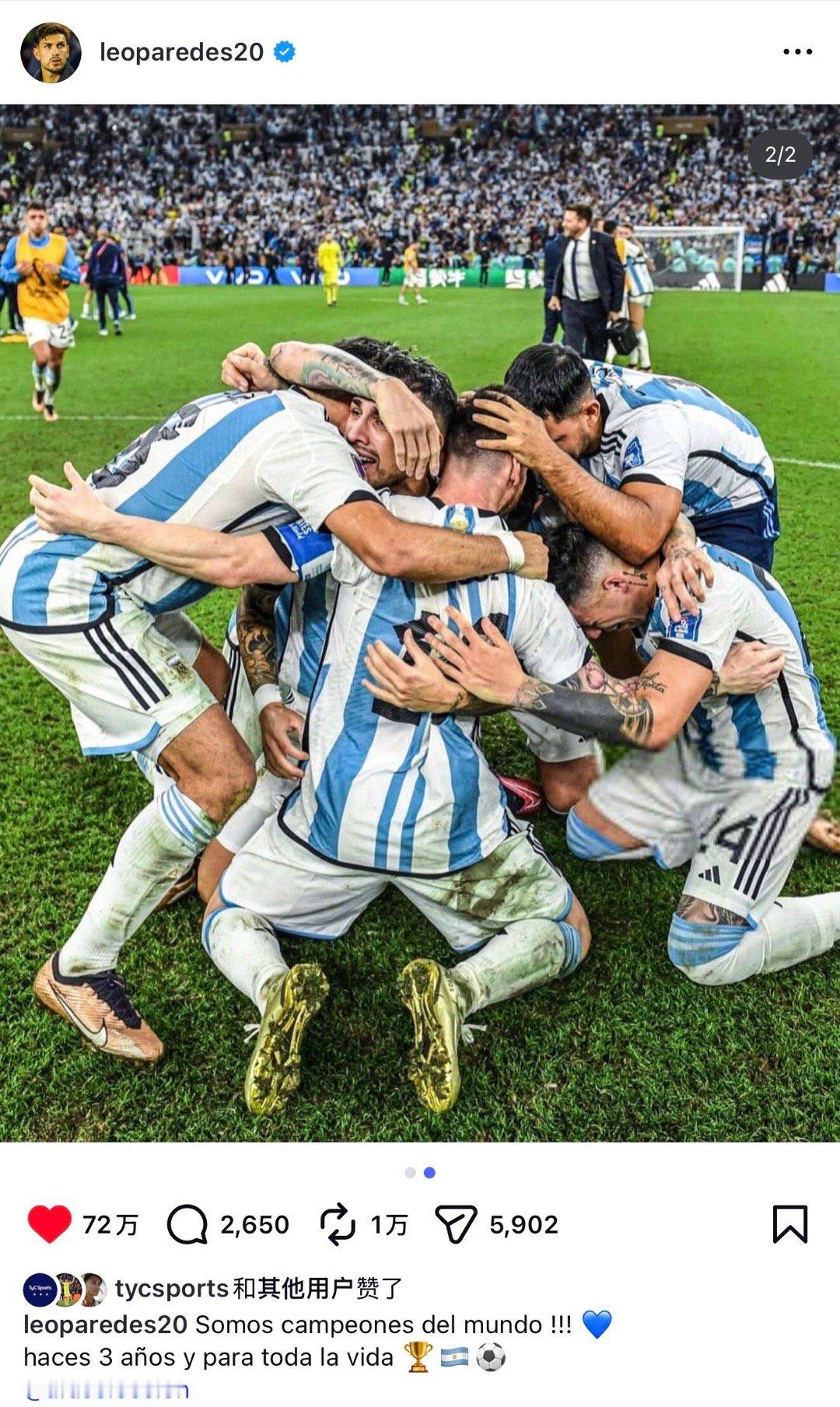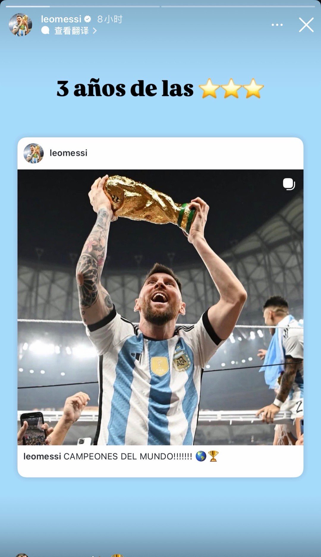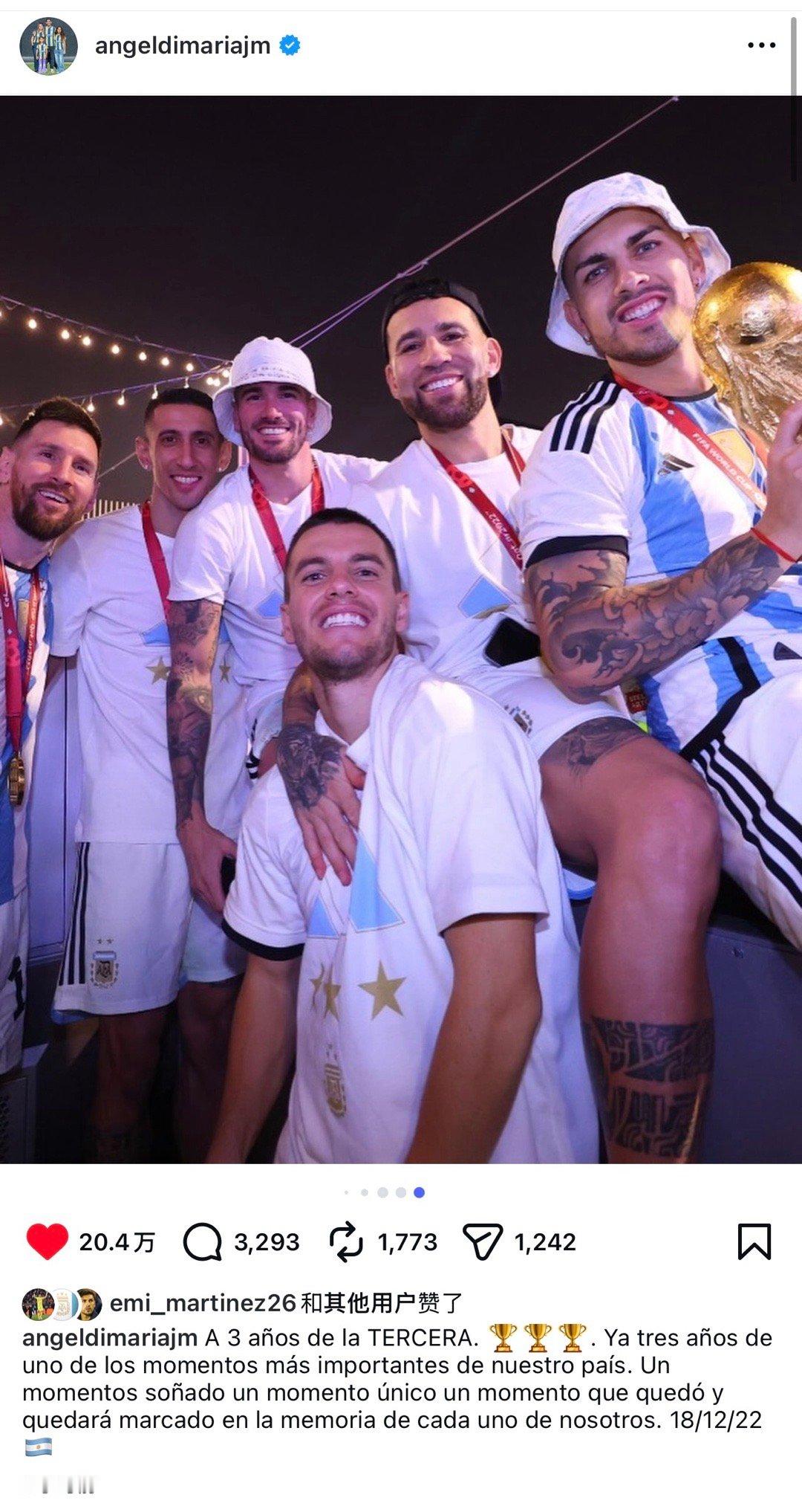 20251219 多位球员更新IG庆祝阿根廷夺冠三周年|迪巴拉:“岁月流逝,情谊犹存!亲爱的阿根廷人,三周年快乐 💙🇦🇷⭐️⭐️⭐️”阿尔瓦雷斯:“三周年,三颗星⭐️⭐️⭐️”利桑德罗·马丁内斯:“成为世界冠军已经三年了,这是一段将伴随一生的历史。阿根廷人,周年快乐!18/12/2022 🇦🇷🏆”迪马利亚:“第三个冠军的三周年🏆🏆🏆 距离我们国家最重要的时刻之一,已经过去整整三年了,一个梦寐以求的时刻,一个独一无二的瞬间,一个已经并将永远铭刻在我们每个人记忆中的瞬间。22年12月18日 🇦🇷”帕雷德斯:“我们是世界冠军!!!💙 已经过去三年,但这份荣耀将伴随一生 🏆🇦🇷⚽️ ”以及一些IG快拍,图文均为和梅西的合影。阿根廷世界杯夺冠三周年阿根廷vs法国