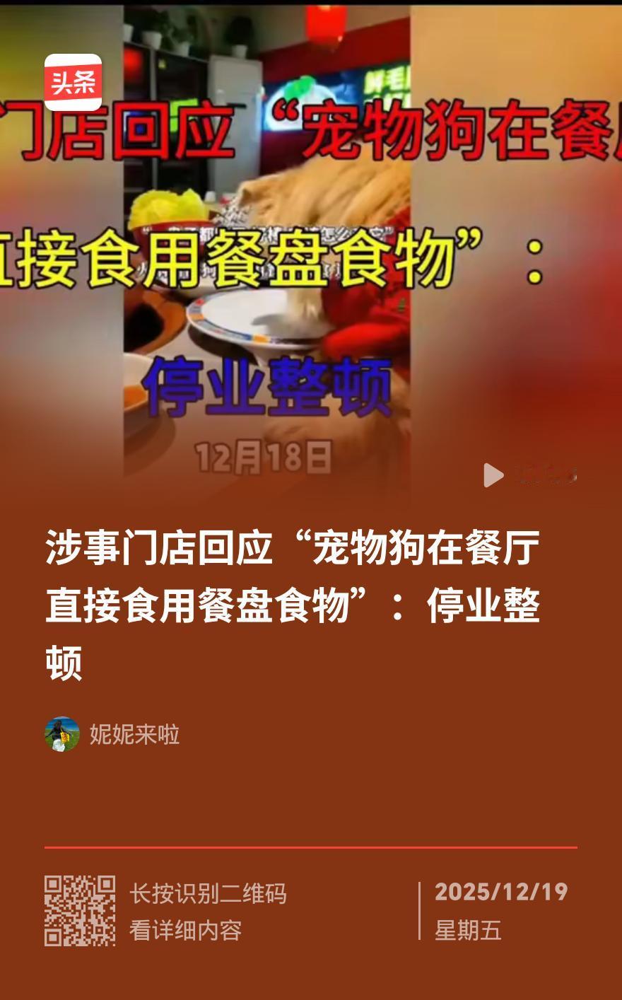 北京一火锅店因宠物上桌停业 涉事食客被追责 12月16日晚,北京石榴园北里一家88元自助火锅店爆出离谱一幕:一名食客竟将黄毛宠物狗抱上餐桌,任由狗狗啃食盘中生肉卷,全程对周围食客的不适视若无睹。 邻桌顾客看不下去,悄悄拍下视频发到网上,很快引发热议。不少网友吐槽,火锅店是给人吃饭的地方,哪能让宠物上桌,既膈应人又存在卫生隐患。 面对舆论,涉事火锅店回应称,店员当时第一时间上前劝阻,事后也对涉事区域和餐具做了全面消毒。即便如此,店铺还是被责令停业整顿,同时全额退还了当天食客的餐费。目前,火锅店已启动法律程序,追究涉事食客的相关责任。 如今不少人把宠物当成“毛孩子”,出门逛街吃饭都带在身边,但公共场合有公共秩序,宠物上桌吃饭不仅破坏他人用餐体验,还可能带来病菌传播风险。 这次事件也给所有人提了个醒:爱宠没有错,但必须守住公共文明的底线,别因为自己的不当行为,给他人和商家添麻烦。 要不要我帮你提炼这篇快讯的核心信息清单,方便你快速转发或整理?火锅店事故 火锅店乱象 火锅店遭差评 青花街火锅店