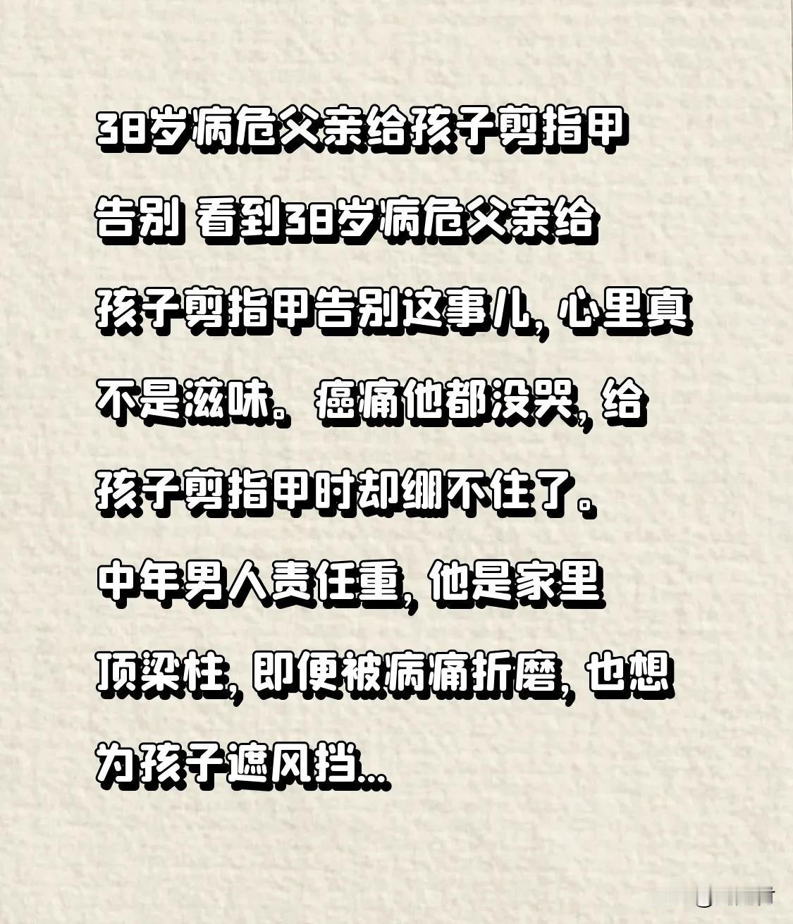38岁病危父亲给孩子剪指甲告别 38岁病危父亲给孩子剪指甲告别,看到这一幕,心酸不已。被癌痛折磨时,他未曾落泪,给孩子剪指甲时,却再也忍不住了。 中年男人肩负着家庭重任,是家里的顶梁柱。即便被病痛狠狠折磨,他仍想为孩子遮风挡雨。可面对无法继续照顾孩子的残酷现实,他的心理防线彻底崩塌。 这位父亲的妻子发文思念,字字泣血。38岁,本是美好的年纪,有儿有女,爱人相伴,父母健在,却被病魔无情打败。他带着不甘与不舍离去,家人都没来得及好好告别。 父爱如山,平日沉默无声,关键时刻却令人动容落泪。这也提醒着我们,珍惜与家人相处的每一刻。 爸爸弥留之际