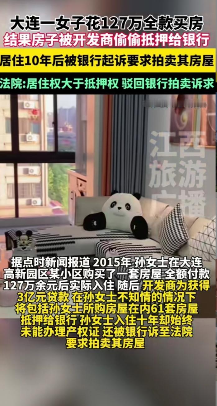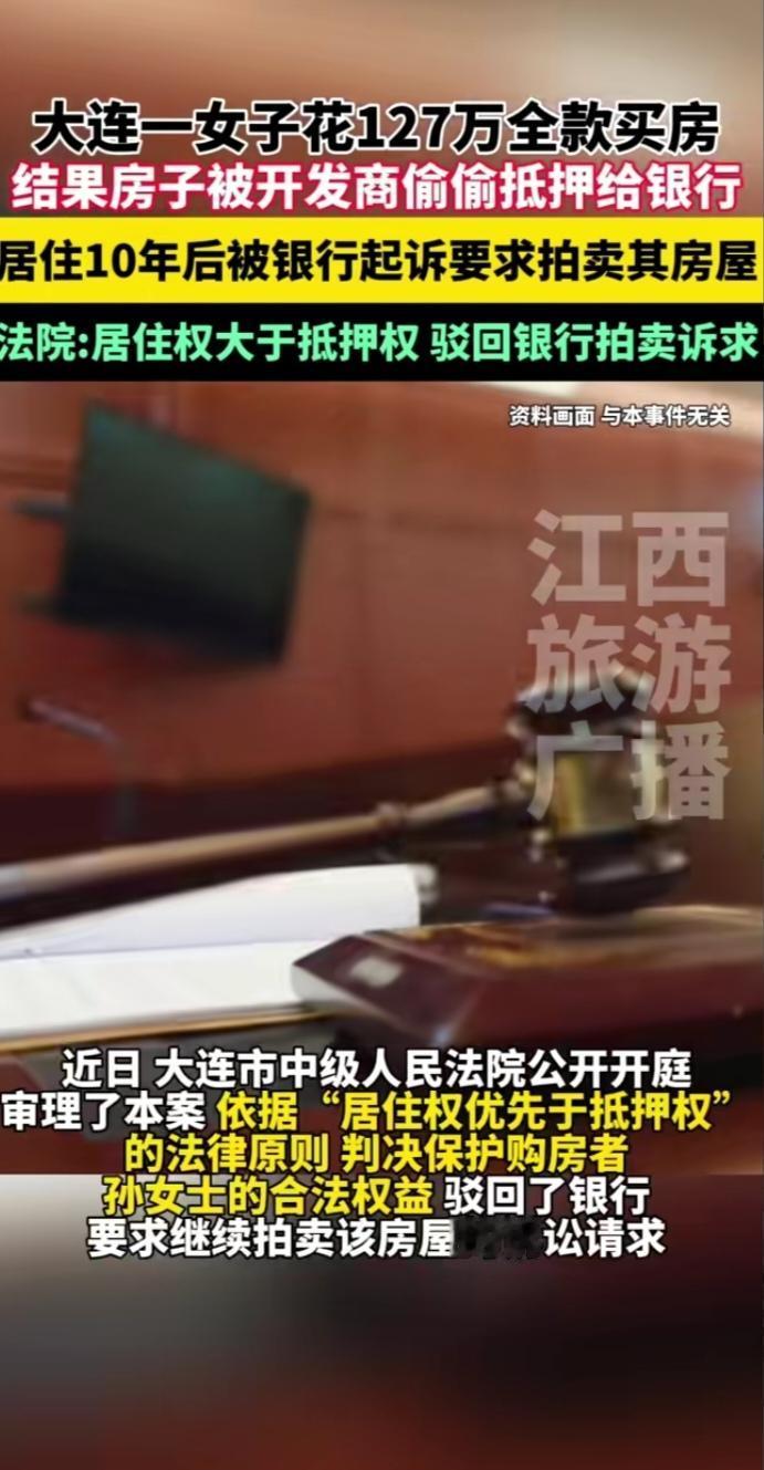 大连惊现“十年安居劫”:127万全款房突遭拍卖,居住权终胜抵押权 大连高新园区,一套承载着家庭十年烟火气的房子,竟藏着横跨九年的惊天骗局。2015年盛夏,孙女士怀揣127万余元全款,在售楼处签下《商品房买卖合同》,手握不动产销售电子发票,满心欢喜地开启了新居生活。她未曾想,这场看似圆满的置业,竟是一场漫长维权战的开端。 九年时光里,孙女士数次追问房产证进展,均被开发商以“手续办理中”搪塞。直到2024年12月18日,一纸法院拍卖公告贴上门框,才击碎了她的平静——这套住了近十年的房子,早已被开发商在2016年秘密抵押给银行,换取3亿元贷款。如今开发商无力偿债,银行申请强制执行,61套涉案房屋面临拍卖。 “真金白银买的家,怎能说拍就拍?”孙女士的质问戳中无数人的心。情急之下,她与其他业主抱团维权,委托律师提起执行异议。庭审交锋中,银行坚称抵押权已合法登记,应优先受偿;而律师抛出关键事实:孙女士购房签约、全款支付、实际入住均早于抵押与查封时间,且房屋是其唯一住房。 “安居方能乐业,居住权乃生存之本。”法院最终援引法律规定,认定商品房消费者的居住权优先于抵押权。2025年12月12日,大连中院终审驳回银行诉求,解除房屋查封,16230元案件受理费由银行承担。这场跨越十年的权益博弈,以普通购房者的胜诉落幕。 正义虽迟未晚,但开发商的失信操作仍令人脊背发凉。此事也敲响警钟:购房后需紧盯产权登记,方能筑牢安居防线。你认为该如何避免类似“售后抵押”陷阱?欢迎留言探讨。二手房陷阱 大连房产
