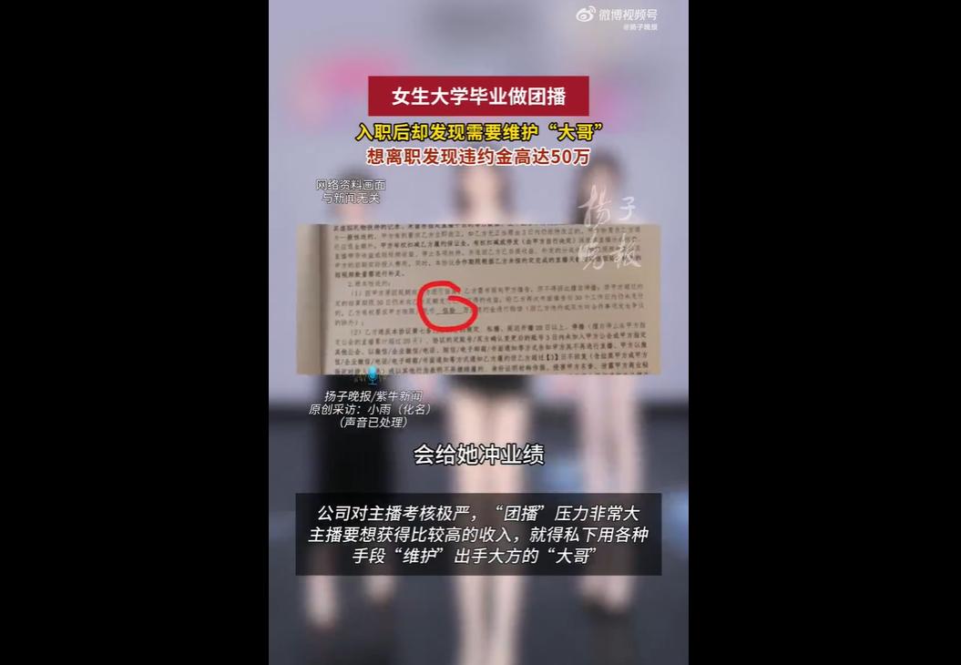 2 岁的小雨大学毕业后入职团播公司,本以为能凭借才艺安稳赚钱,却陷入一场职场骗局。 招聘时公司许诺的优厚待遇全是空头支票,就连基本底薪都难以足额拿到。 更让她难以接受的是,公司核心要求并非打磨才艺,而是让主播用暧昧话术、私下联络甚至线下接触等方式,讨好出手大方的 “大哥” 以换取打赏,擦边互动和私下经济往来成了行业常态。 不堪其扰的小雨工作三个月后决心离职,却被公司拿出入职时签订的协议威胁,索赔 50 万元违约金。 原来公司早就在厚厚的合同里藏下 “坑人条款”,入职时只字不提,离职时却拿出来当作压榨工具,小雨无奈聘请律师应对。 小雨的遭遇绝非个例,而是团播行业野蛮生长的畸形缩影,撕开了行业招聘欺诈、职场异化、合同陷阱的层层黑幕。 这些公司精准拿捏年轻人的求职焦虑,用 “高薪低门槛” 诱骗应届生,将低俗利益交换包装成职业要求。 而监管滞后难以跟上行业扩张速度,让乱象肆意蔓延。 这也警示所有年轻人,求职切勿急功近利,面对 “轻松高薪” 的诱惑要保持清醒,务必核查公司资质、看清合同每一条款,避免为所谓 “捷径” 付出尊严和法律风险的代价。