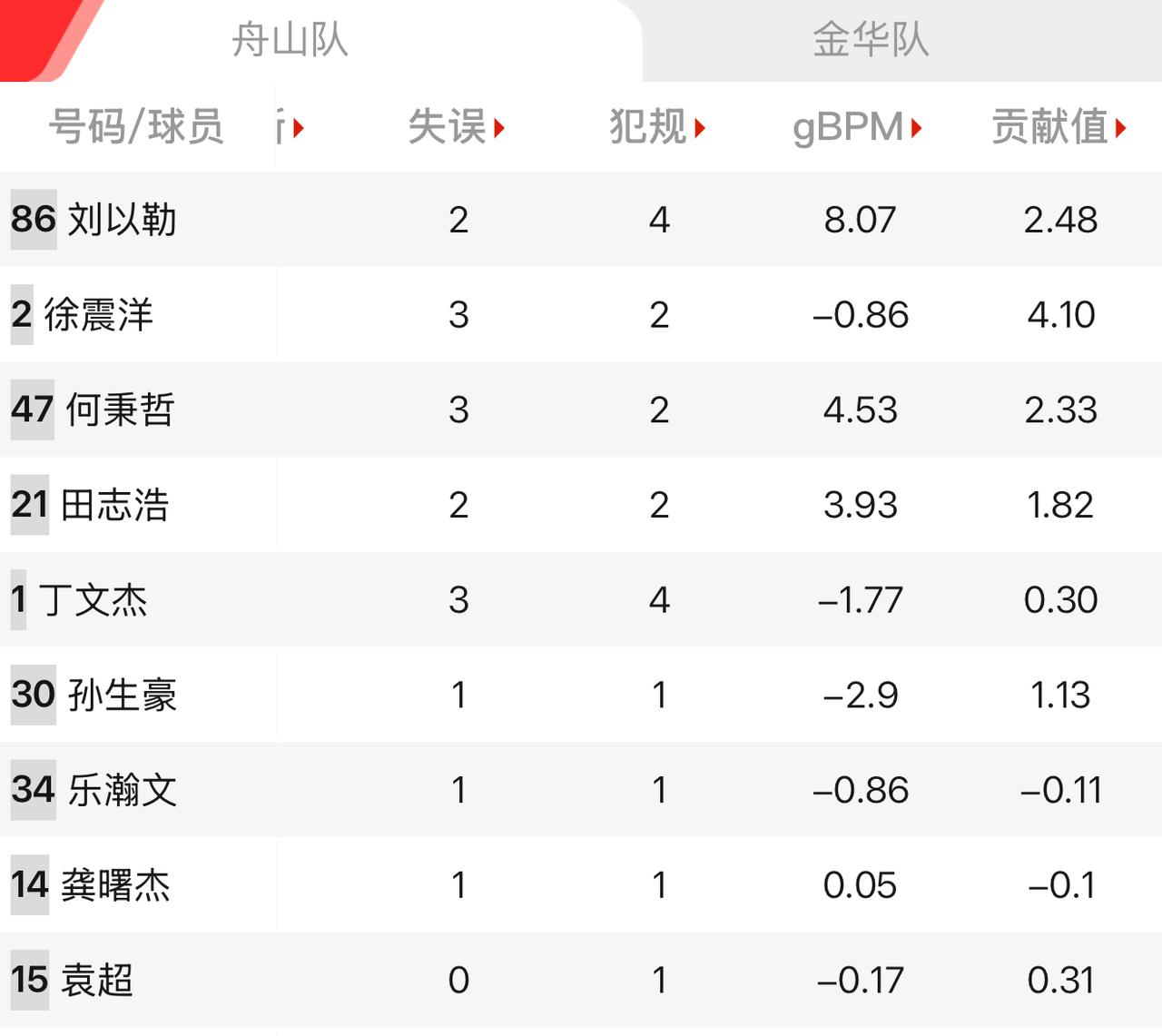 越来越看不懂了,20中4的命中率,全场贡献值还能排第一? 在昨天舟山队不敌金华队的比赛中,舟山队的球员徐震洋20投4中,罚球13中7,拿下16分4板3助2帽1断,贡献值全场第一,甚至超过了刘以勒的21分10板和范围的21分6板!真是奇怪,难道真的有隐藏防守数据加在里面? 而金华队在赢下本场比赛以后,以胜场优势重回前四,把台州队挤到了第五,金华队还剩下3场比赛,台州队还剩4场,两队目前胜场积分就差1分,所以谁进谁汰还真不好说!关键一场就在最后一场,金华对阵台州的那一场! 大家支持金华队晋级还是台州队晋级?金华队 台州队 浙BA赛况