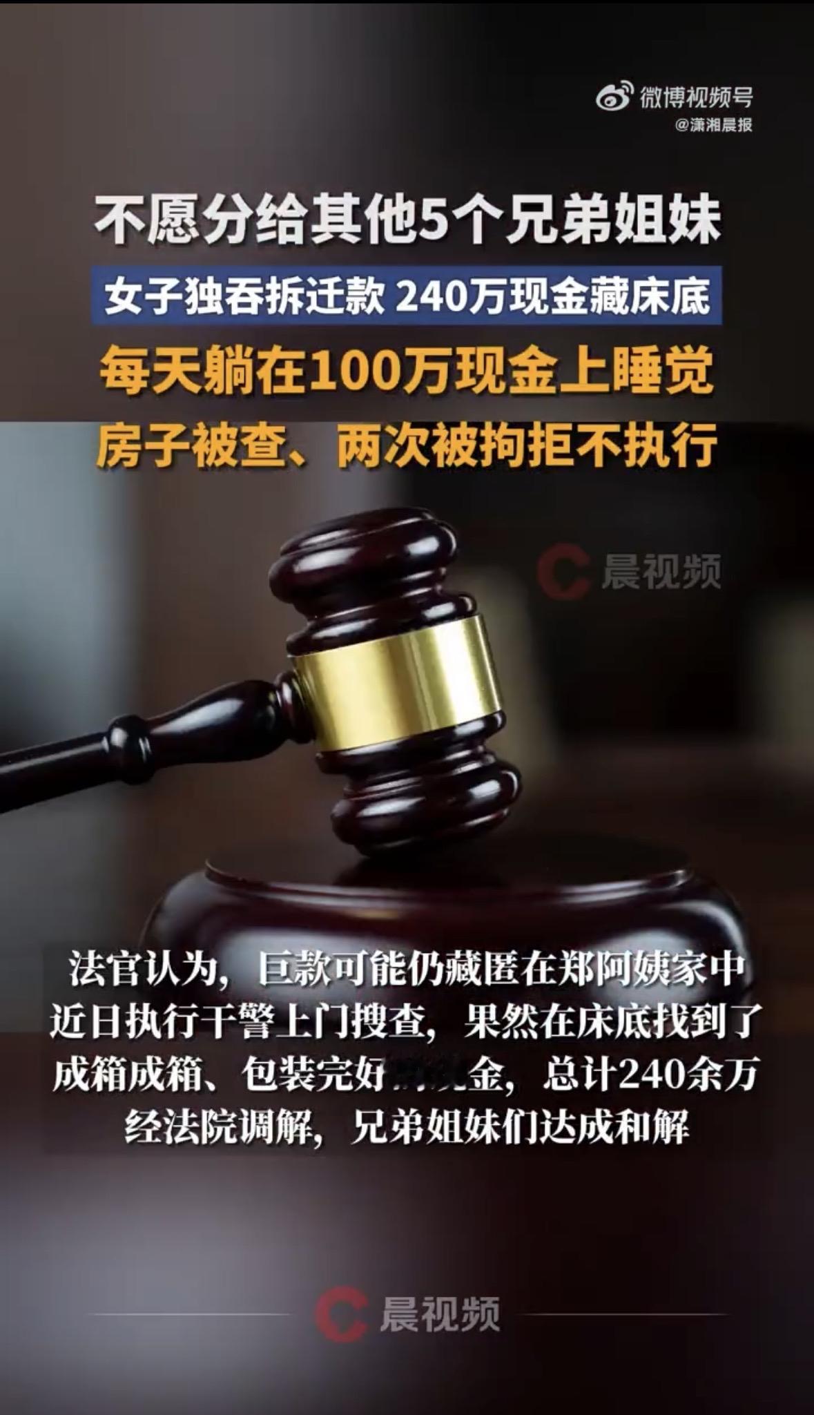 床底下搜出100万现金!牛奶盒里还塞着几十捆钞票!一个普通人家哪来这么多钱?真相让人心寒。 上海郑阿姨作为长女,户口落在母亲老宅。2019年老宅征收,她独自领走280万补偿款。母亲把亲生女儿告上法庭,法院判决这笔钱归母亲所有。可没等执行,老人病逝了。 280万瞬间变成遗产,六个兄弟姐妹都有权继承。但郑阿姨咬死不拿钱,法院判决成了一纸空文。执行法官判断:“这钱肯定还藏在她家里!” 果然,干警在她家床底翻出整箱现金,连牛奶盒都塞满钞票。240多万现金就这么藏着,宁可发霉也不愿分给手足。 说实话,看到这儿真觉得悲哀。父母留下的本应是温暖记忆,如今却变成床头床尾的算计。但法院最后没简单处理——他们了解到郑阿姨长期照顾父母,其他子女付出较少。 经调解,兄弟姐妹各退一步达成和解。法律给出了刚性判决,却用温情留下了转圜余地。家事难断,但血浓于水。钱财能算计清楚,亲情账本又该怎么算?这件事让我看到:法律有尺度,也有温度。