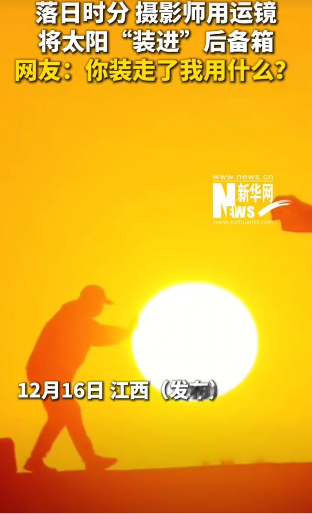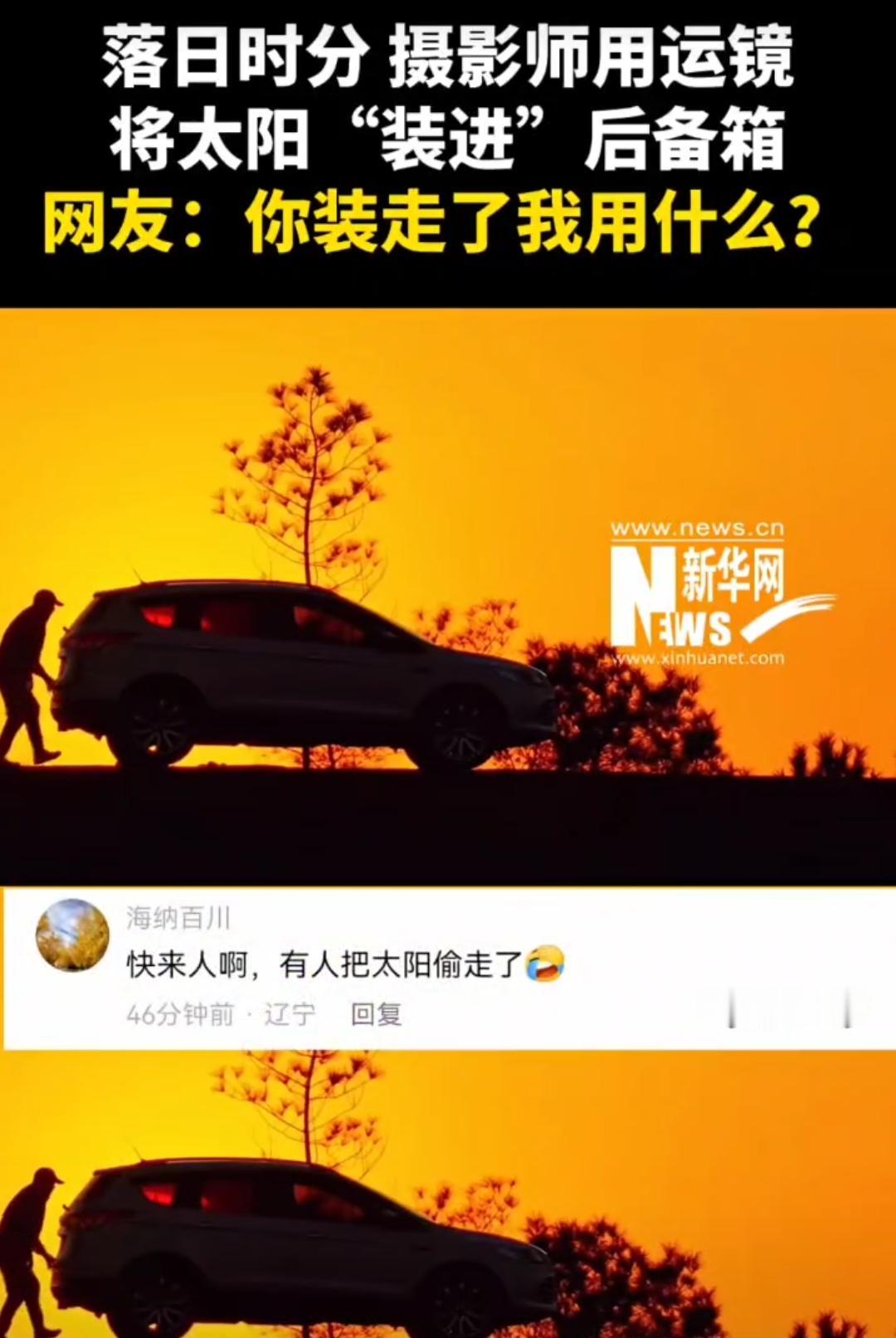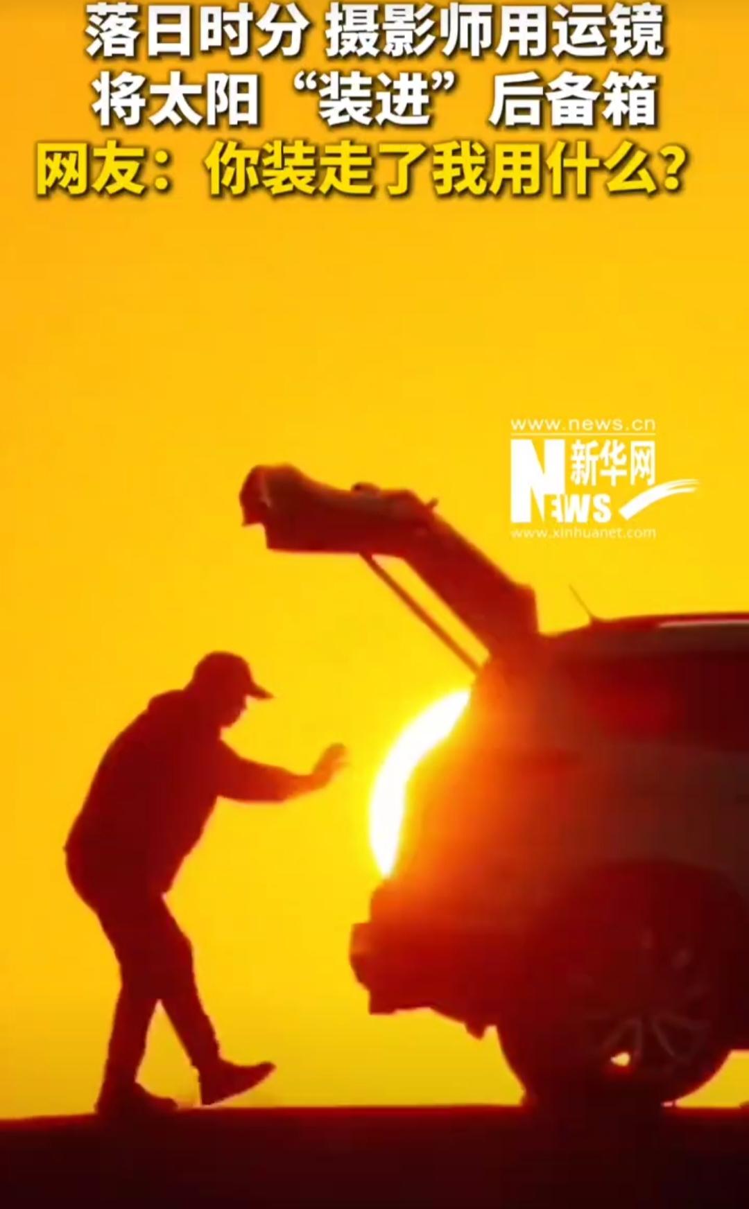 人怎么可以浪漫成这样! 摄影师用运镜将太阳“装进”后备箱。 这才是最顶级的诠释, 我把太阳带回家。 网友说:你装走了我用什么? 摄影师这一浪漫的举动, 真的是暖化了我的心。 日子怎么可以和谁过都一样呢? 怎么可以有人这么浪漫呢? 平淡无奇的日子, 因为这种浪漫而无比精彩, 无比美好。 当他把落日的温柔偷进后备箱, 我的心动却被这浪漫漾满了整片黄昏。 小时种太阳,长大偷落日, 大叔心里依然装着一个大男孩儿, 好调皮。 热爱生活的人生活中不会缺乏幸福 和发现美的眼睛, 果然有趣的灵魂万里挑一。