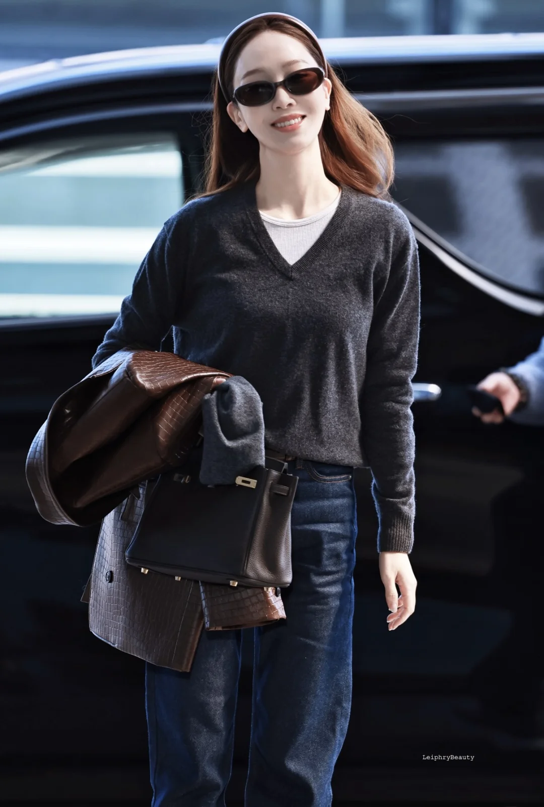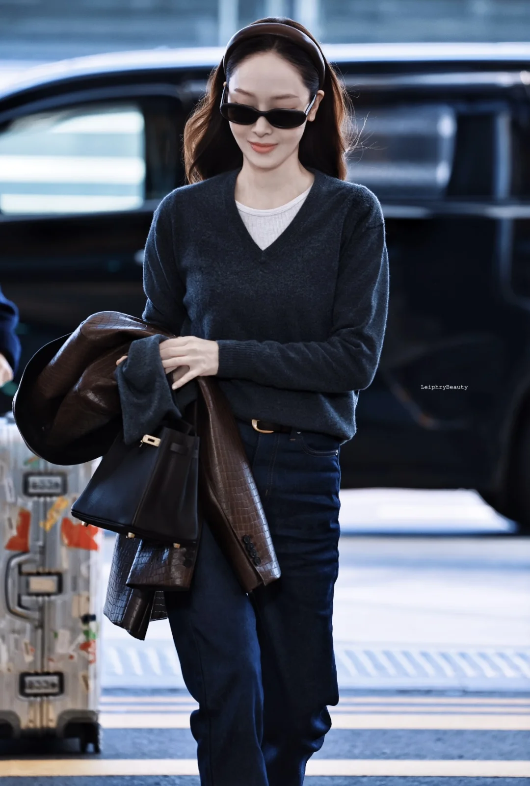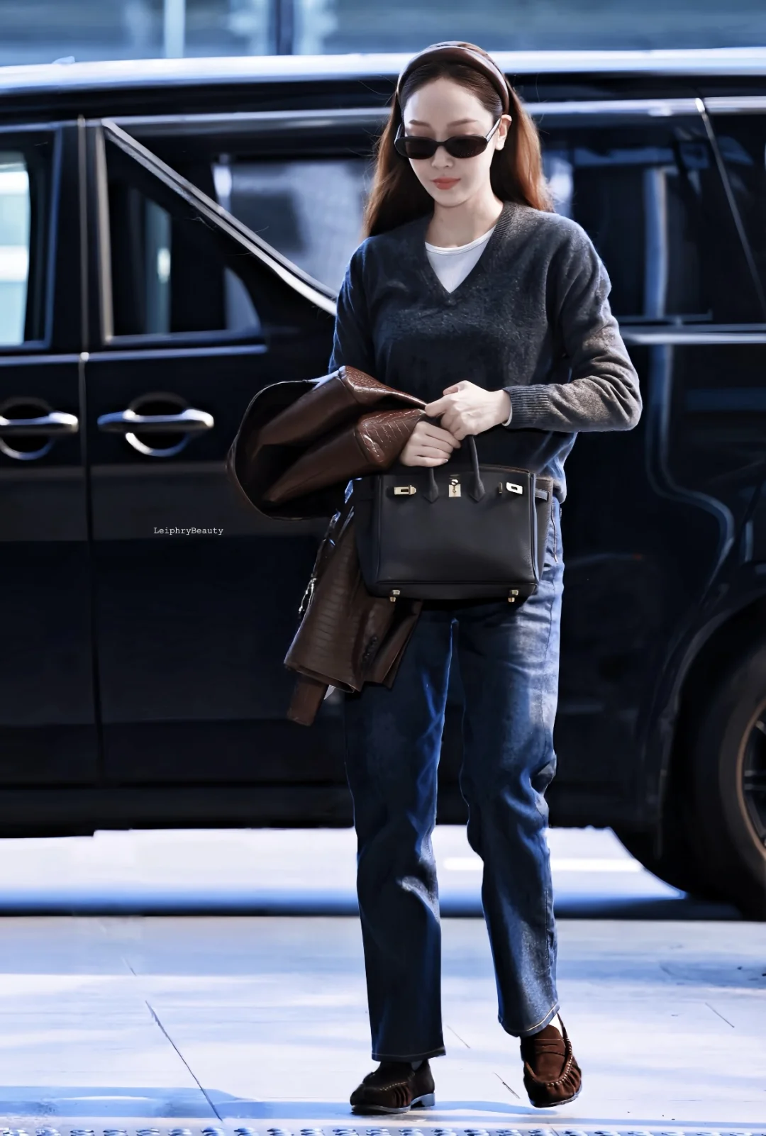 又又又被郑秀妍的老钱风机场穿搭惊艳到!普通人也能复刻的思路: 1. 选款优先经典版型:放弃紧身款,选宽松的V领针织衫和直筒牛仔裤,舒适感是松弛感的前提,老钱风偏爱“藏肉又大气”的版型; 2. 色彩走低饱和路线:深灰+藏蓝+棕色的大地色系组合,沉稳又高级,没有跳脱的颜色,却能穿出质感; 3. 用皮革单品提气质:哪怕没有大牌包,选一款棕色皮质包包/腰带/鞋子,就能给基础穿搭注入老钱风的精致感,Jessica的皮衣随手拎着,更是把“不刻意”的松弛感贯彻到底。