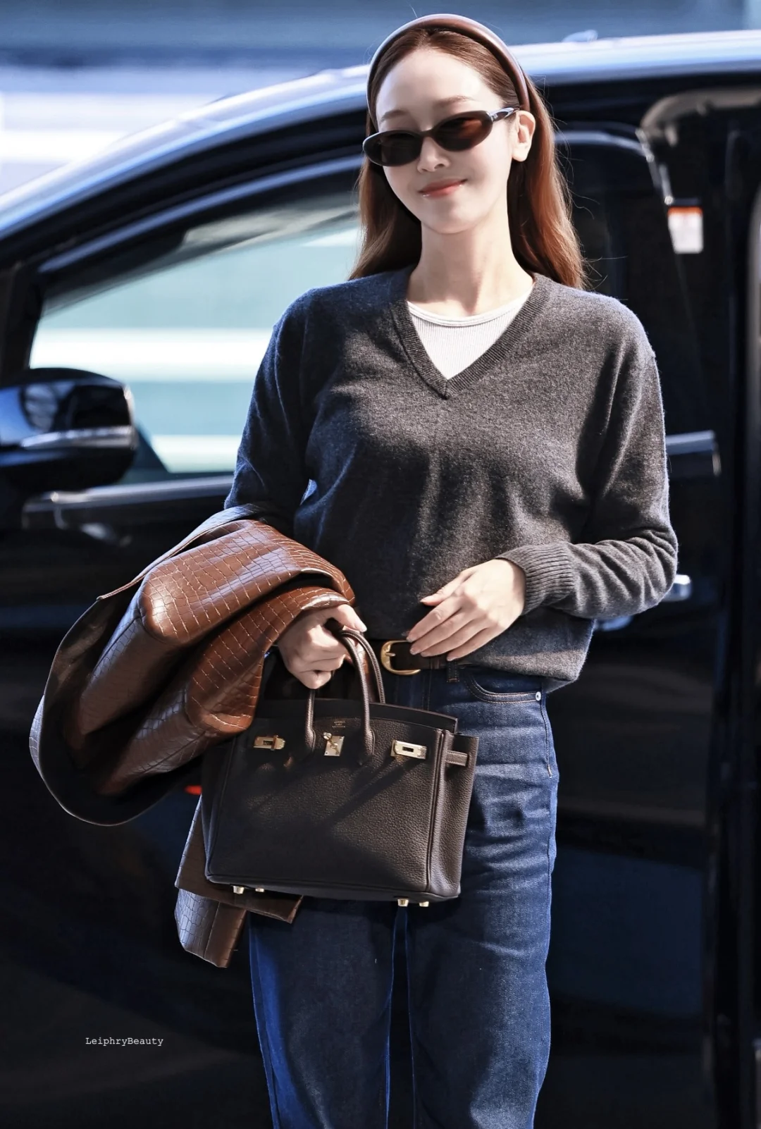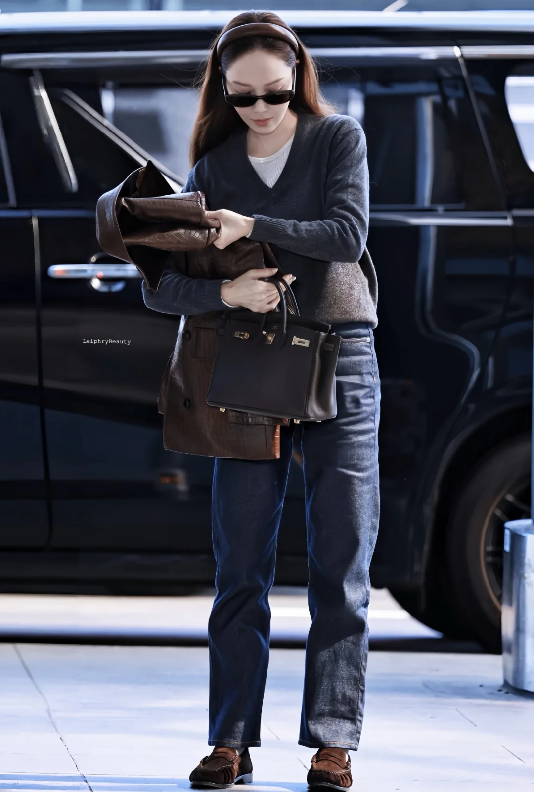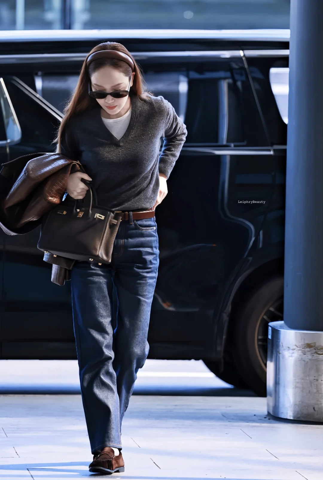 又又又被郑秀妍的老钱风机场穿搭惊艳到!普通人也能复刻的思路: 1. 选款优先经典版型:放弃紧身款,选宽松的V领针织衫和直筒牛仔裤,舒适感是松弛感的前提,老钱风偏爱“藏肉又大气”的版型; 2. 色彩走低饱和路线:深灰+藏蓝+棕色的大地色系组合,沉稳又高级,没有跳脱的颜色,却能穿出质感; 3. 用皮革单品提气质:哪怕没有大牌包,选一款棕色皮质包包/腰带/鞋子,就能给基础穿搭注入老钱风的精致感,Jessica的皮衣随手拎着,更是把“不刻意”的松弛感贯彻到底。