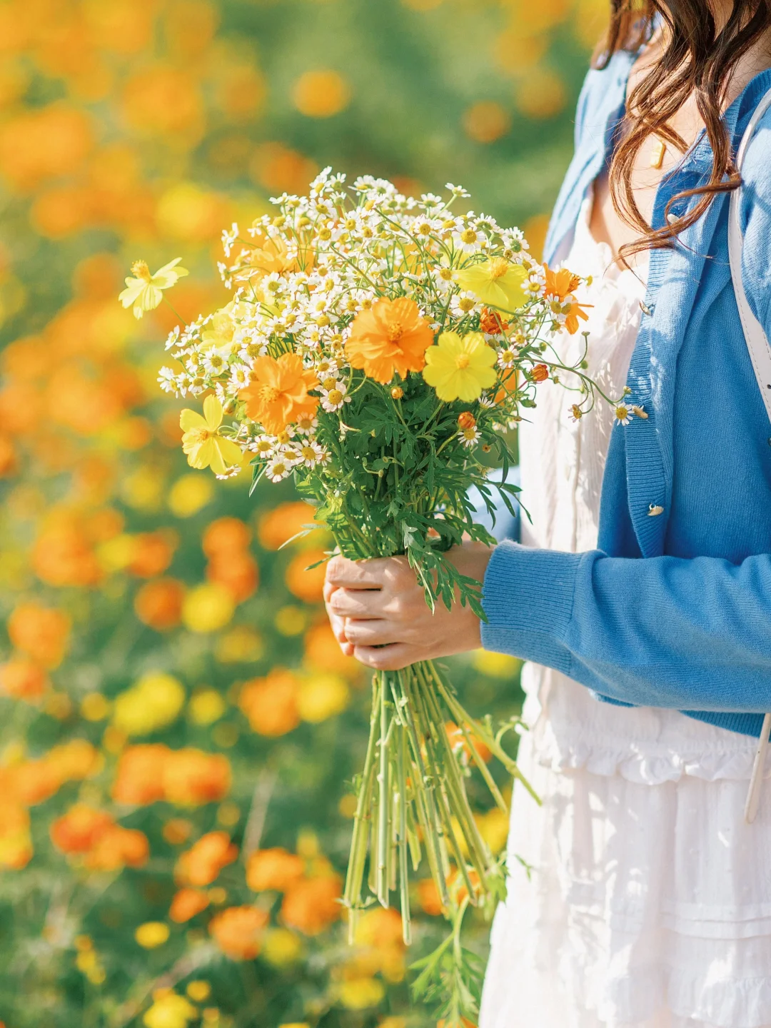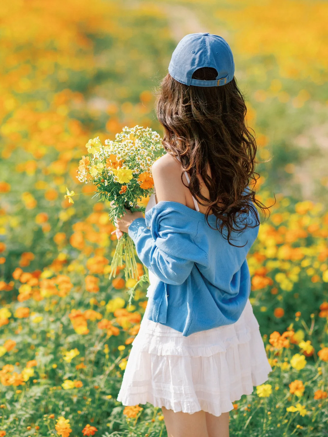 搭配了蓝色上衣形成撞色的效果