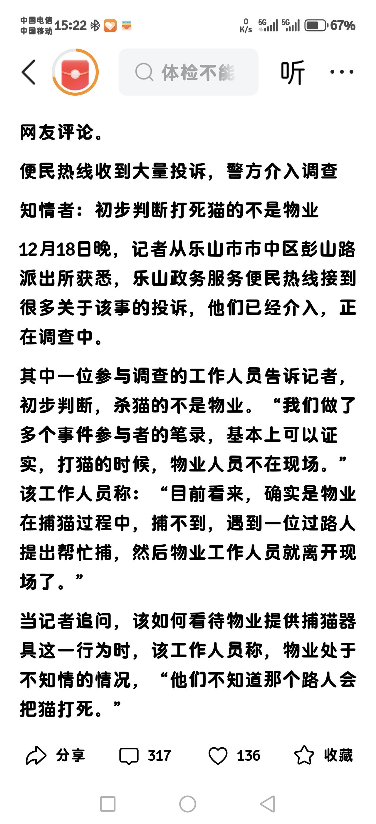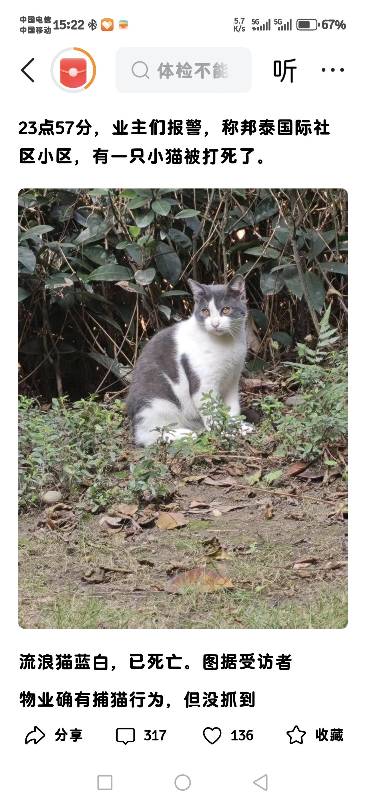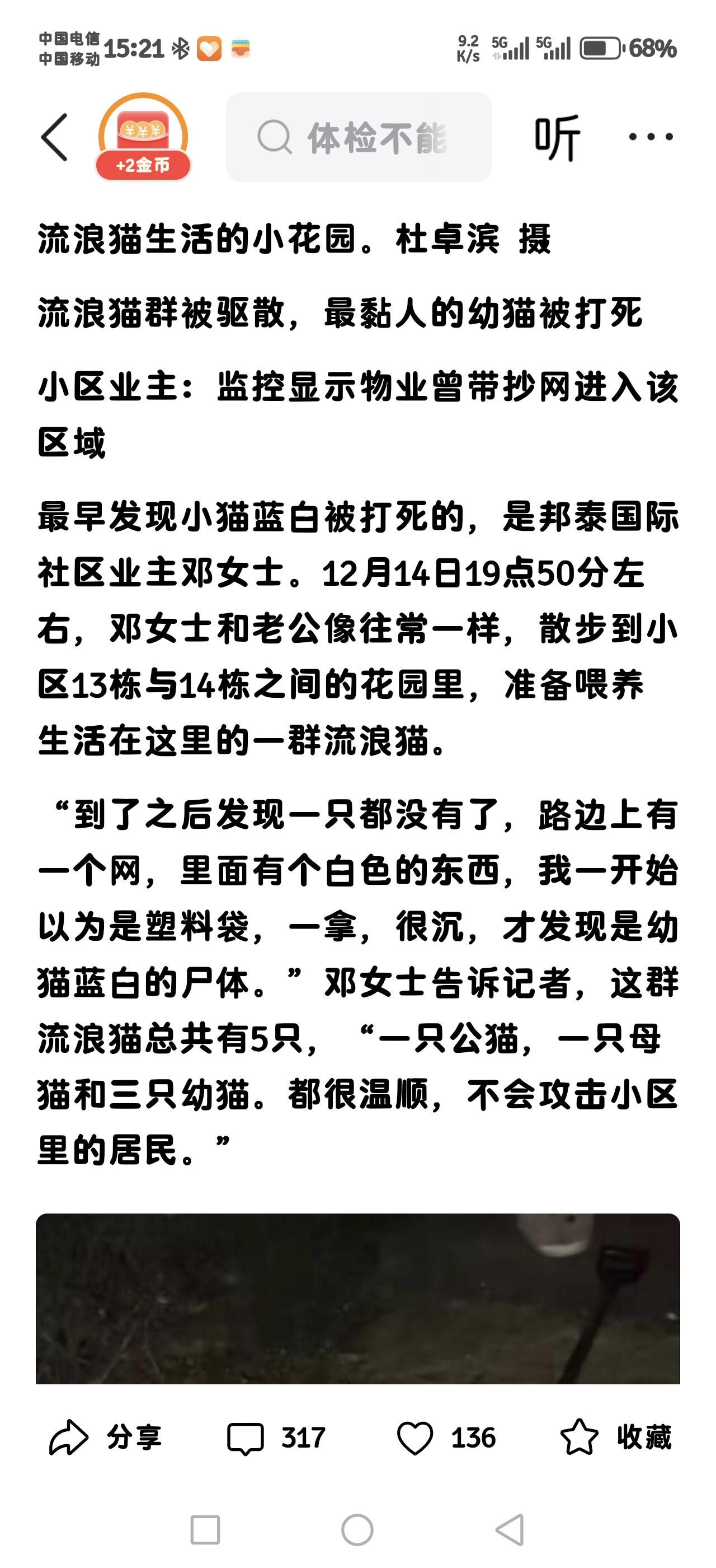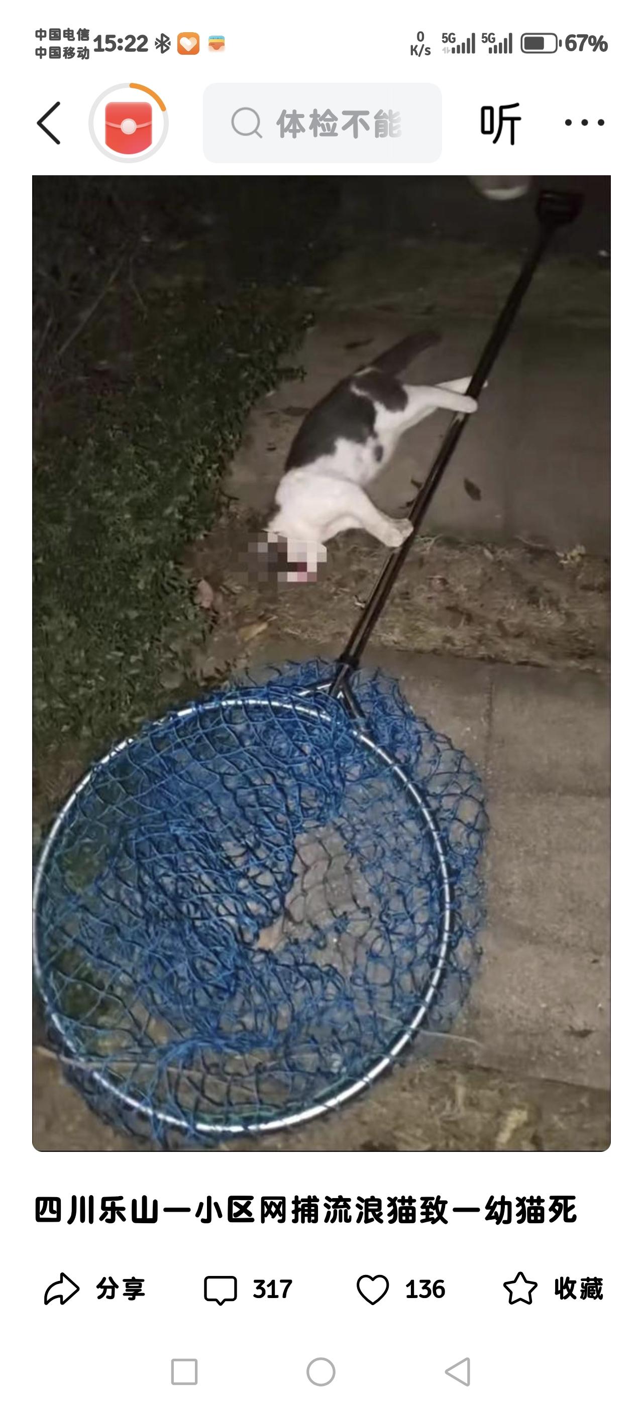 连日来,四川乐山邦泰国际社区小区物业用抄网捕捉流浪猫,其间一幼猫被打死的消息引发广泛争议,网友普遍质疑邦泰物业的流浪猫治理方式。12月17日,当地一流浪动物救助保护中心发文谴责:“棍棒之下无治理”,要求物业停止攻击流浪动物。小区居民也在和物业沟通的同时,自发领养余下的流浪猫。