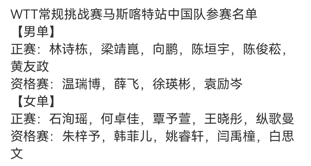 2026年马斯喀特常规挑战赛报名名单出来了。 国乒男单林诗栋,女单石洵瑶领衔出战