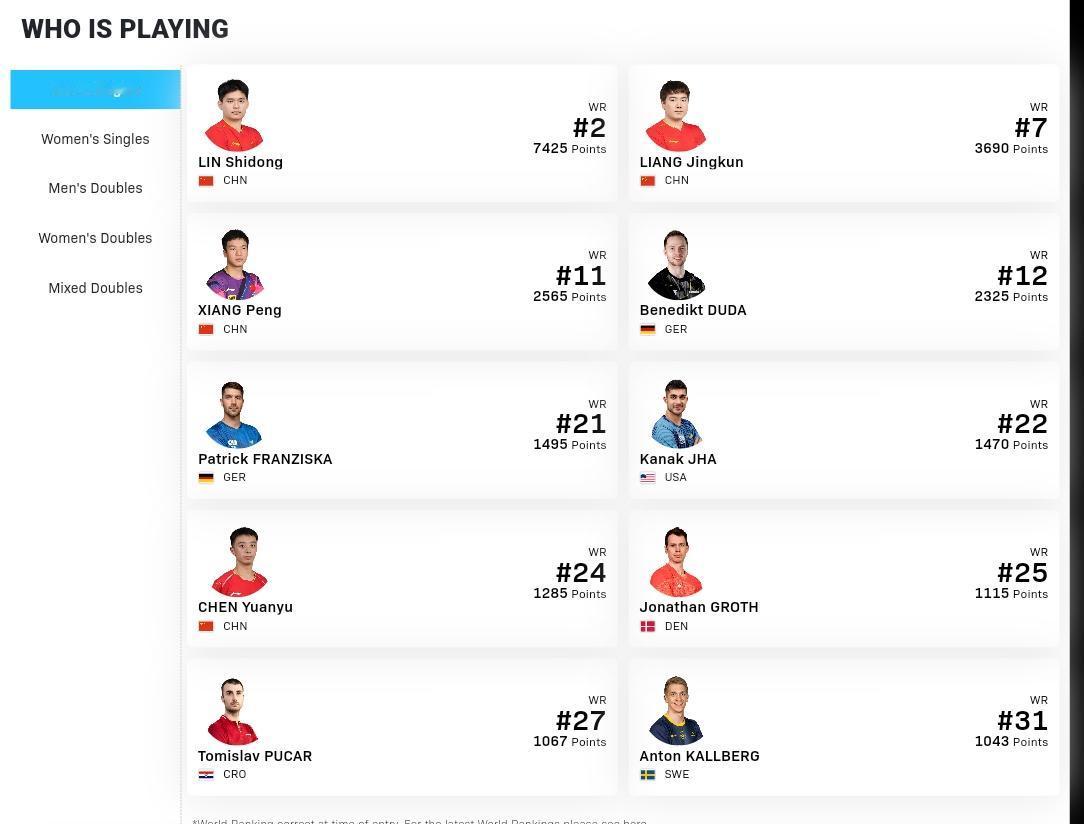 2026年马斯喀特常规挑战赛报名名单出来了。 国乒男单林诗栋,女单石洵瑶领衔出战。 往日参赛劳模日韩未见报名。
