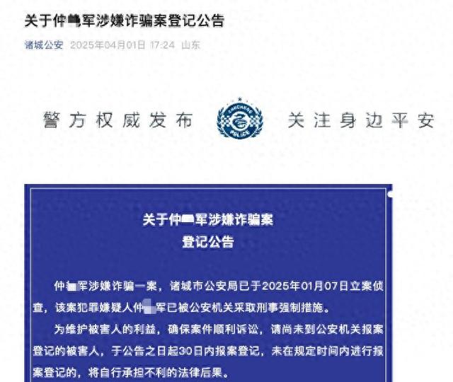 澎湃新闻此前报道,仲某军声称自己和领导有关系,可以为他人办理补缴社保。受害人前往诸城市政务服务中心或人社局窗口(办公室)签署劳务合同等资料后,每人向仲某军缴纳十几万元的办理费用,但迟迟未能办成。2025年1月7日,诸城市公安局对仲某军涉嫌诈骗一案立案侦查。