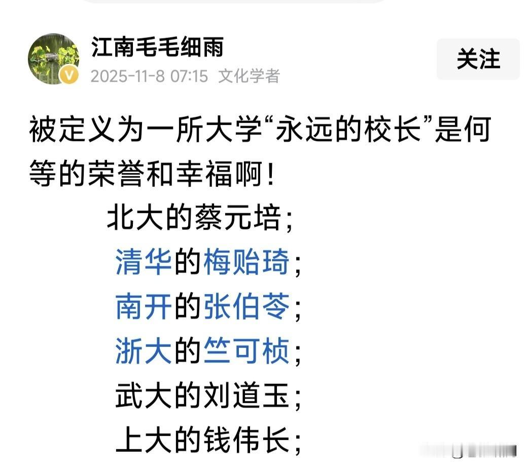 易中天说:刘道玉是永远的校长!他的这一评价,来自于刘道玉先生一句话:教育不是统一思想,而是唤醒思想! 有网友提到北大的蔡元培,清华的梅贻琦,南开的张伯苓,浙大的竺可桢,上大的钱伟长,都堪称“永远的校长”! 甚至有人提到张伯苓梅贻琦,和蒋梦麟联合创办的“西南联大”,是中国大学的“天花板”!本人很赞同这样的评价。 思想在于不断创新!只有如此社会才能进步,国家才能发展,民族才能强盛!“西南联大”为国家培养大量人才啊! …………