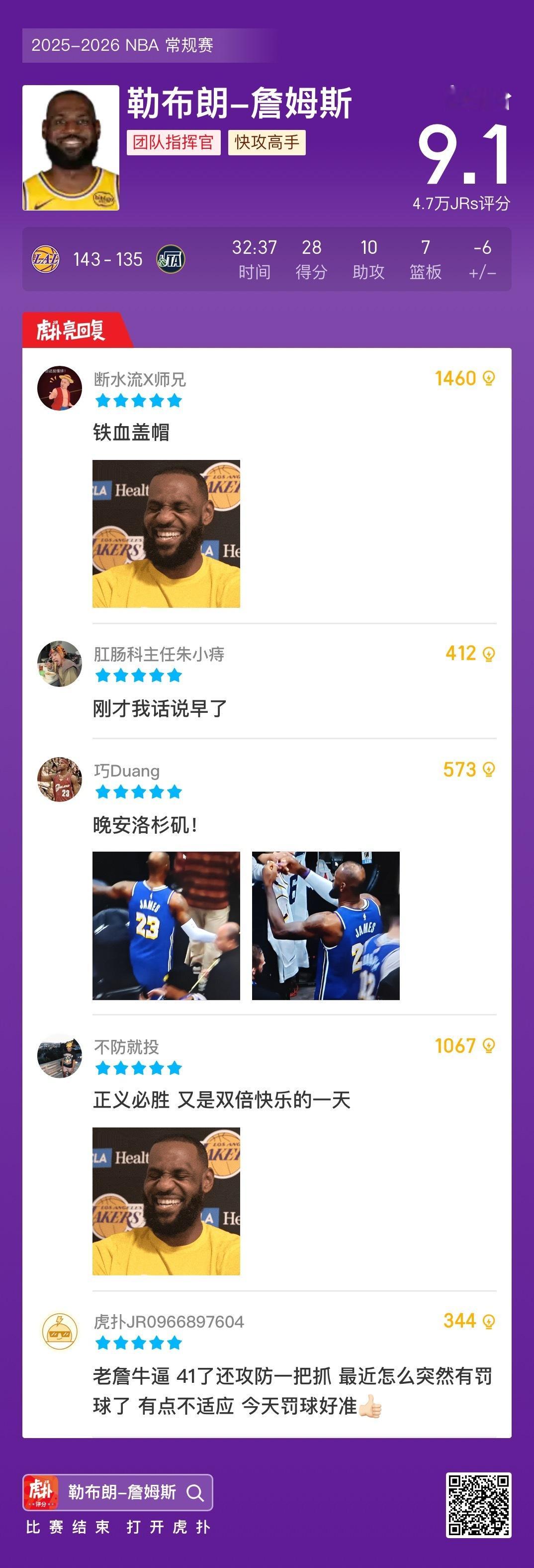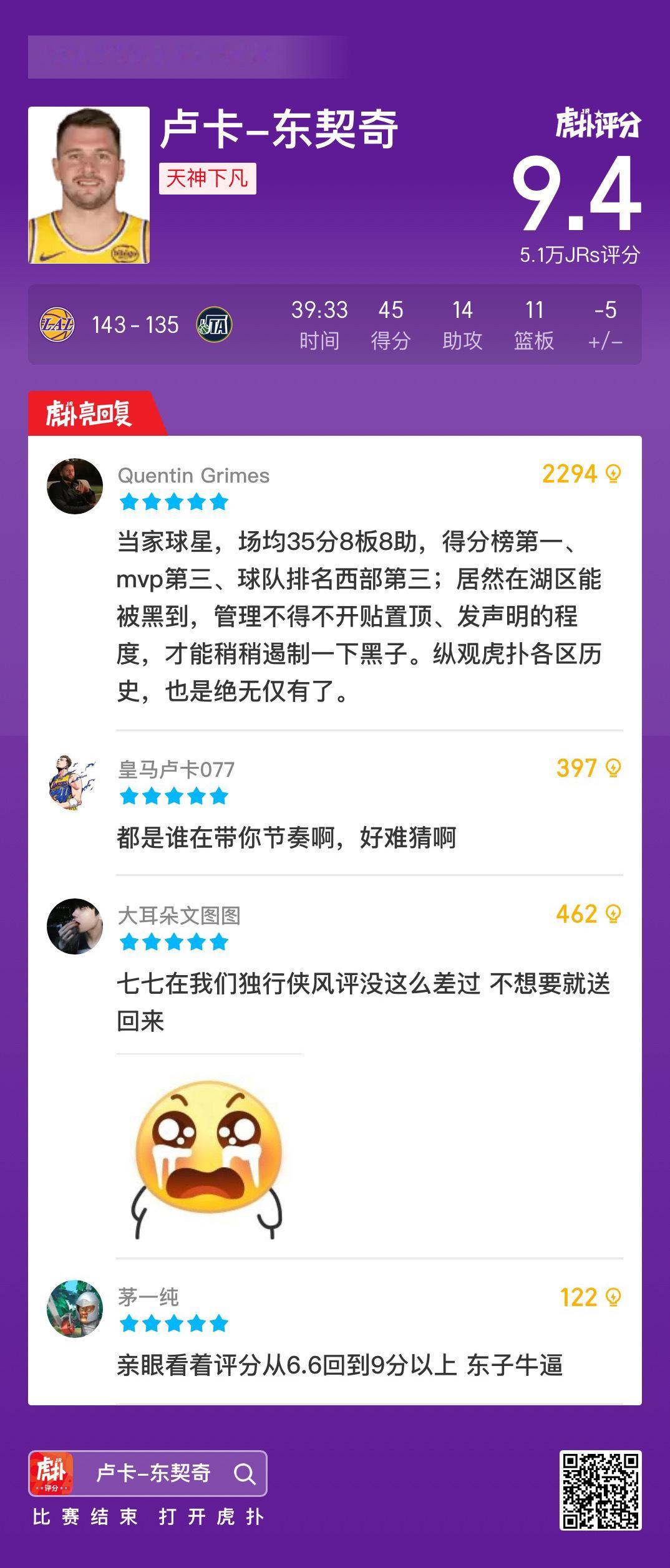 豪华三双!东契奇全场28中14,砍下45分11篮板14助攻5抢断NBA常规赛,湖人143-135战胜爵士,末节实现逆转。湖人球员东契奇全场28中14、三分12中4、罚球16中13,砍下45分11篮板14助攻5抢断。勒布朗-詹姆斯出战33分钟,全场17中8,三分5中0,罚球13中12得到28分7篮板10助攻1抢断。东契奇45分豪华三双湖人vs爵士