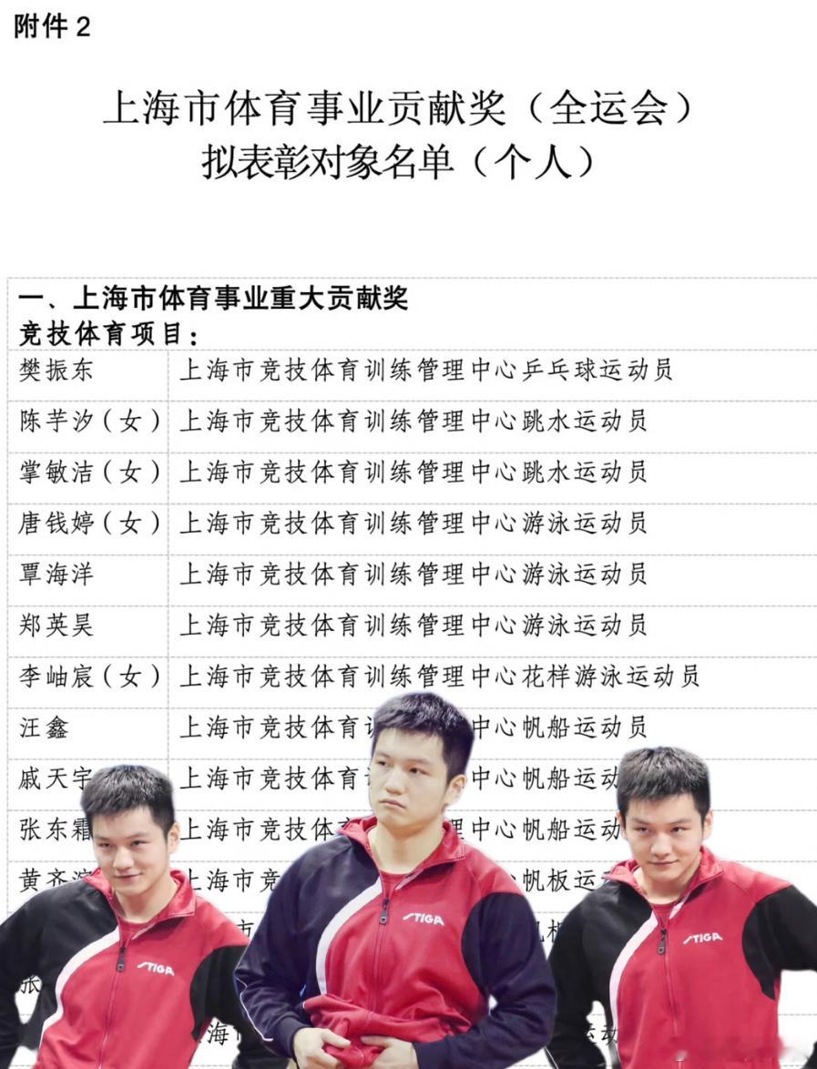 樊振东获上海市体育事业重大贡献奖 上海劳动模范风采馆宣传已上新上海市人力资源社会保障局会同市体育局、市教委,对在第十五届全国运动会和第十四届全国冬季运动会上作出杰出贡献的上海运动员和教练员开展记大功奖励工作。其中乒乓球运动员樊振东在列!他斩获乒乓球男单卫冕冠军,同时带领上海队夺得男团银牌,恭喜樊振东,实至名归!