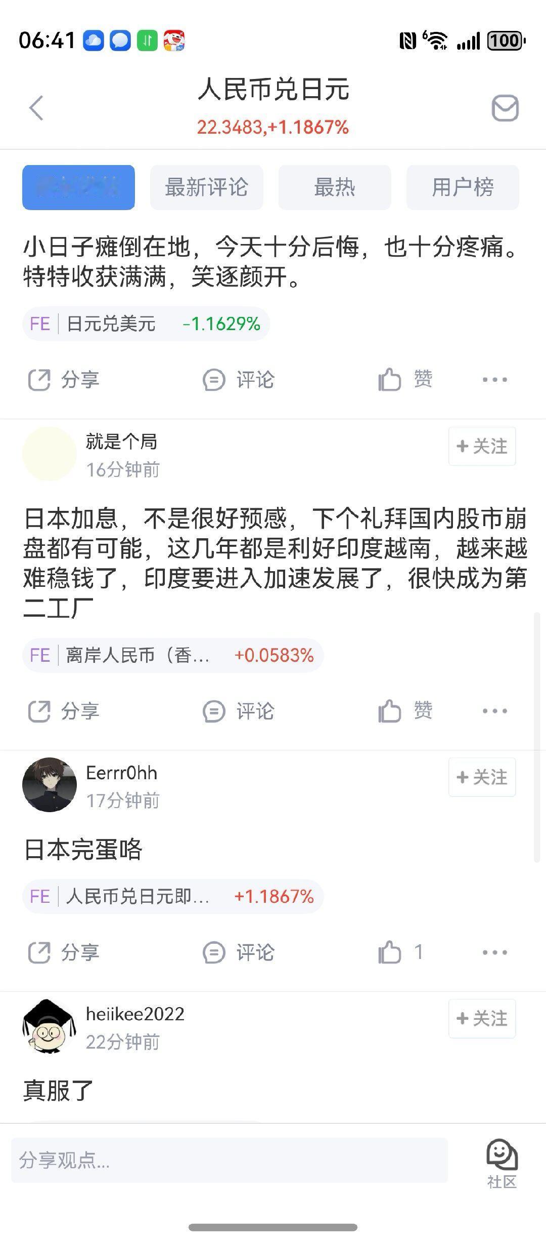 日元日本 日元今天加息日元不演了,我感觉是他们自己人在做空21年到现在日元对RMB跌了50%了,真是恐怖。还有人说日元到底了要抄底这才刚开始跌啊还在做梦大A要跌,是啊从3000跌到3800了,明年上4500。