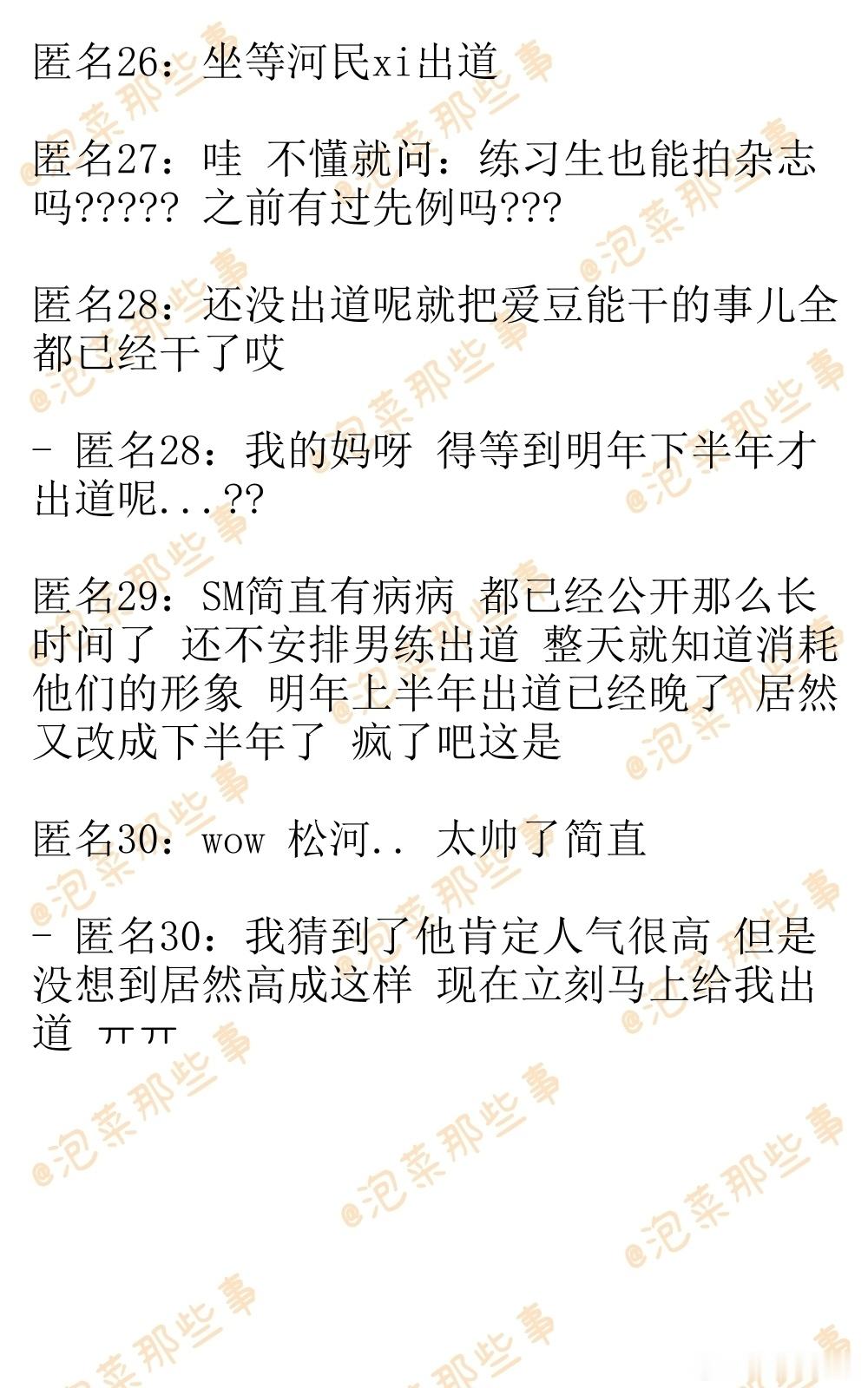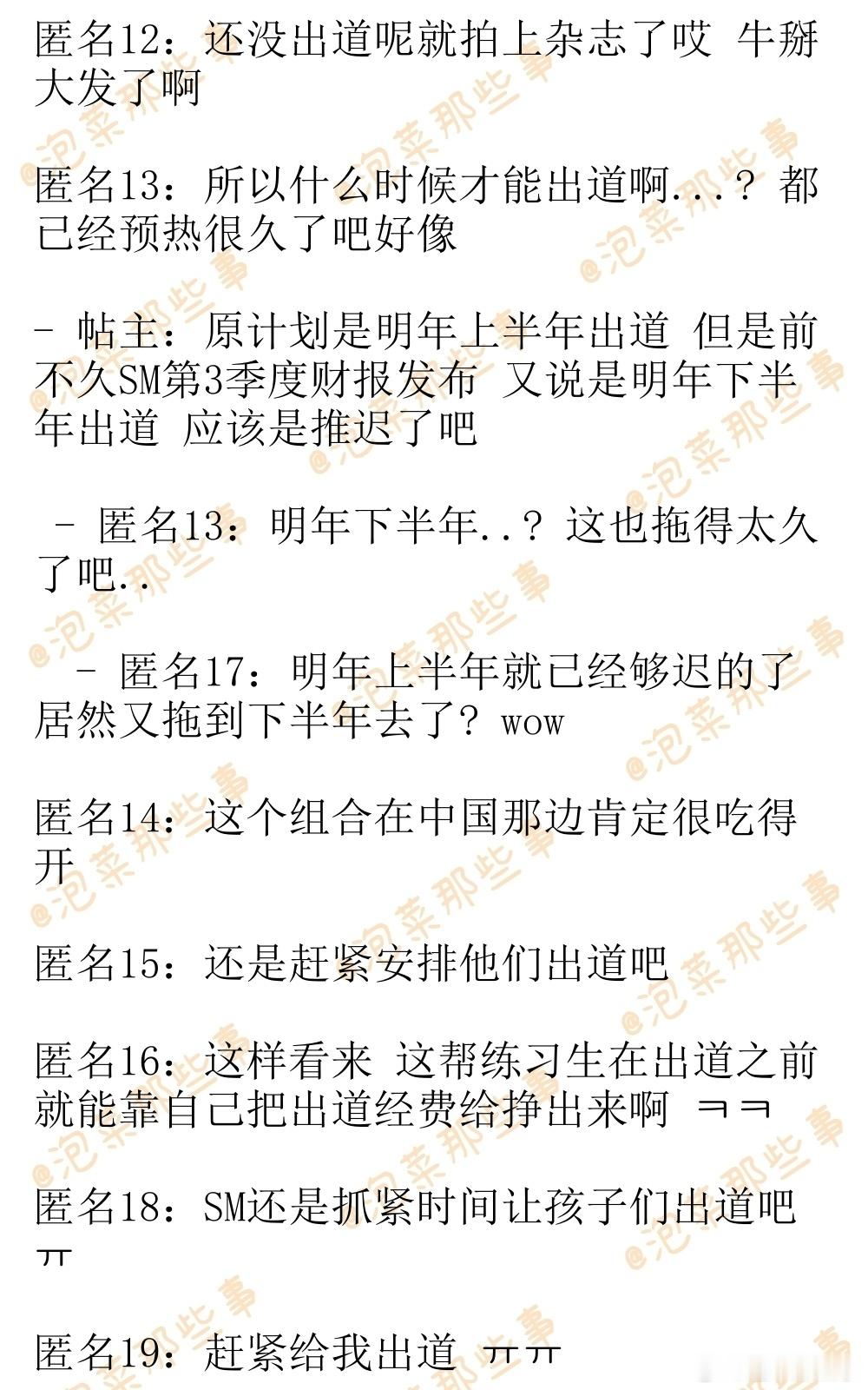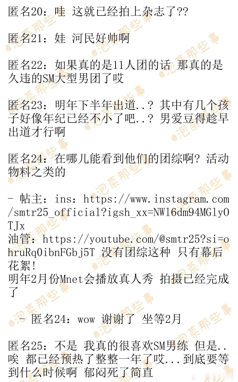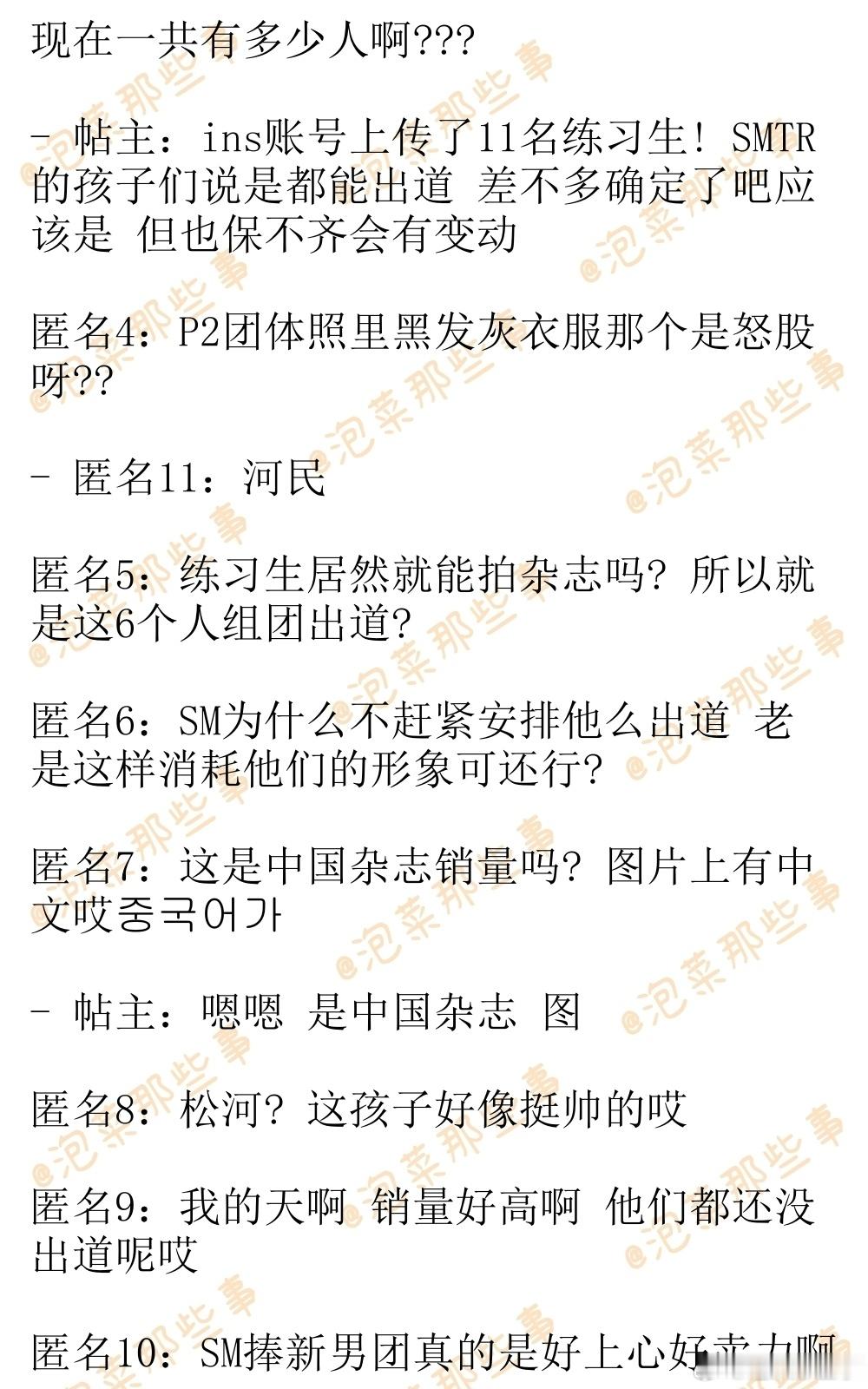 🔥韩网热帖评论翻译🔥SM男练SMTR25中国杂志销量单人封面:李松河 5万本以上李河民 4万本以上吴弦俊 1万本以上Daniel 1万本以上李翰飞9千本TATA 700本团体封面:6000本以上开售时间: 12月17日14:11~cr.instiz