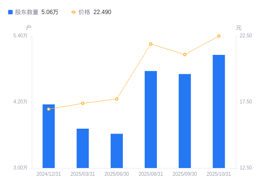 近一年(2024年12月31日至2025年10月31日),上海沪工A股股东户数从4.16万户,增加至5.06万户,增幅21.64%,区间股价上涨29.12%。