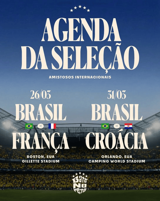 虎扑12月19日讯巴西国家队官方宣布,3月将在2026年世界杯的东道主国家美国举办两场友谊赛: