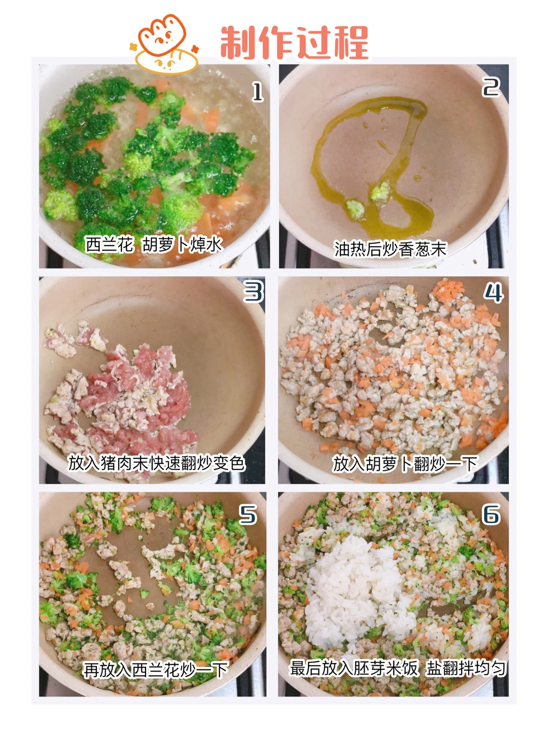 🎈锅中油热后,放一点葱花炒香,再放入肉末快速翻炒变色,再依次放入胡萝卜和西兰花翻炒一下,最后放入胚芽米饭和盐,炒匀盛出备用。
