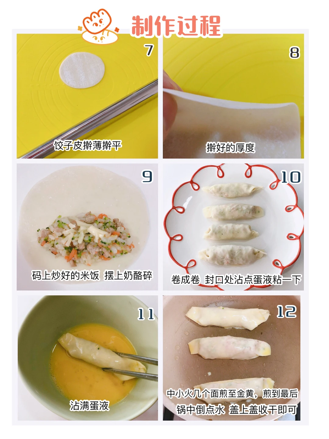 🎈饺子皮尽量擀薄一些,码上米饭,上面撒上奶酪碎,卷成卷,封口处用点蛋液粘一下,两头捏紧即可。