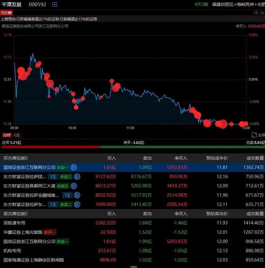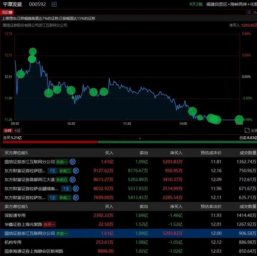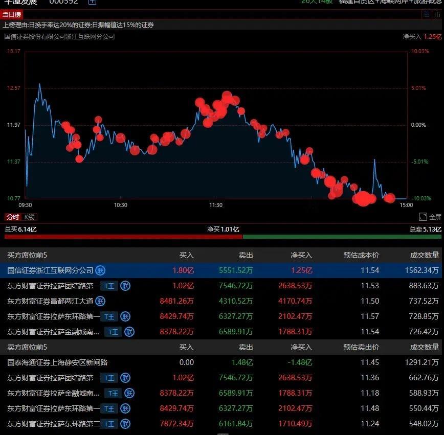 平潭发展(000592)现在应该是到了击鼓传花的最后阶段了,后面别再相信所谓的弱转强的机会,炒作上去纯粹就是资金抱团的结果,这样的票高位就要看形态和量价关系了。并不像在底部还能凭各种讲故事支撑抱团紧密程度。其实平潭发展在经过一波凌厉的上涨后,在没有实质的逻辑支撑下,抱团资金都是有惯性的。在11月6日的首次跌停出现,还可以认为是资金的分歧,在后面在再次的转强上涨,其量能一直没能突破。在11月17日顶出一字板的情况下,周一(11月21日)却出现低开!这就是严重的不及预期,盘中有拉贡动作,其实都是骗取资金信仰分歧转一致的预期。随后就是连续的两天跌停,这就是第一次的拉高出货动作。11月27日之后再次用拉高出货的动作,连续三天拉升缩量,紧接着就是虚晃一枪的短暂拉升后,快速的下杀直到再次摁倒跌停。然后又是一波同样的手法拉升,在高位出现再次的跌停,周四看似出现弱转强,但量能是缩减的,今天继续缩量早盘还在推升,看吸引不来资金了,然后就在尾盘直接瀑布式下杀。这应该是看下面接单综合起来直接够出货大部分了吧。再看看今天的龙虎榜单卖出榜,国信证券浙江互联网分公司席位卖出最多,全天都在卖出,后面的砸盘应该也是它的主。再看12月17号的跌停,龙虎榜上卖单,他同样是卖出首榜,但还在少量波段买入,还想做差价啊!12月3日的龙虎榜这个席位是大仓位买卖,1.61亿买入,1.09亿卖出。对比龙虎榜点阵图,明天是盘中做T,做大成交量,为后面的拉升出货铺垫。再向前看,11月21日一字涨停后的首次跌停,该席位是净买入1.25亿,是在开盘后25分钟开始买入为主,但它也没有想到24日并没有出现快速的弱转强,而是低开后很快又下杀到了跌停,但在跌停上有资金开始翘板。但它同样在做T摊低成本。再向前搜索11月6日的跌停龙虎榜,该席位同样出现,这天是首次出现大分歧,同样是该席位在大幅买卖成交。整体这是当下市场量化资金的一种常用模式,也是他们利用资金优势在这种你高兴充盈的个股上的市场博弈。整体看该席位在平潭发展龙虎榜出现的频次很高。作为量化资金,在平潭发展的前期涨停出现的可能较小,首次出现就是在5板后,一字开板受的高换手10月30日,随后的每次龙虎榜单都有它的身影。这就给我们了解这种量化资金的模式,只有充分的反向研究了解它,才能有充分的应对策略。这需要细细的领悟!