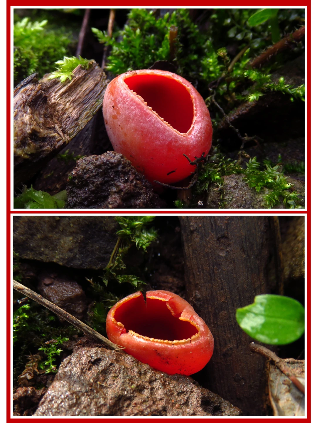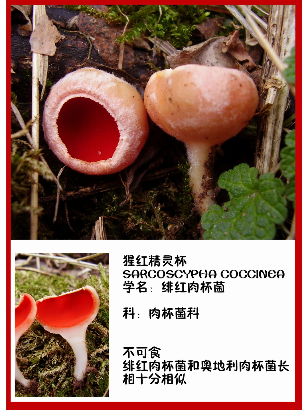 猩红精灵杯 Sarcoscypha coccinea 学名:绯红肉杯菌 科:肉杯菌科 图片©manatarka.org 不可食 绯红肉杯菌(Sarcoscypha coccinea)和奥地利肉杯菌(Sarcoscypha austriaca)长相十分相似 但是,绯红肉杯菌的外面覆盖绒毛是直的,而奥地利肉杯菌的绒毛是卷曲的 当然,我们一般人是分辨不出来的[害羞R]~ ps:感兴趣的话,奥地利肉杯菌可以在我的笔记中找到