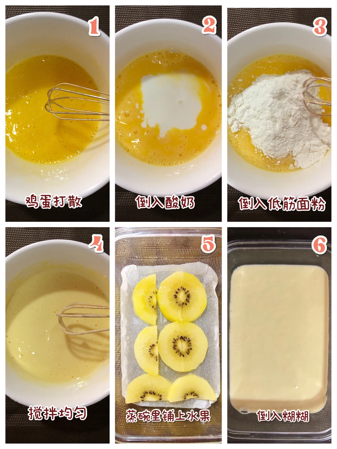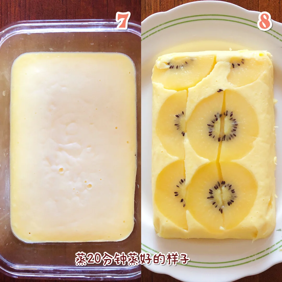 🌈先把鸡蛋打散,倒入酸奶和面粉,搅拌均匀,蒸碗里刷油垫上硅油纸,把猕猴桃切片摆上,均匀的倒入酸奶糊,冷水上锅蒸20分钟,关火焖5分钟,待冷却一会再切[斜眼R] (💡P.S.水果可以换成宝宝爱吃的 像草莓、蓝莓、苹果都是可以哒[赞R])